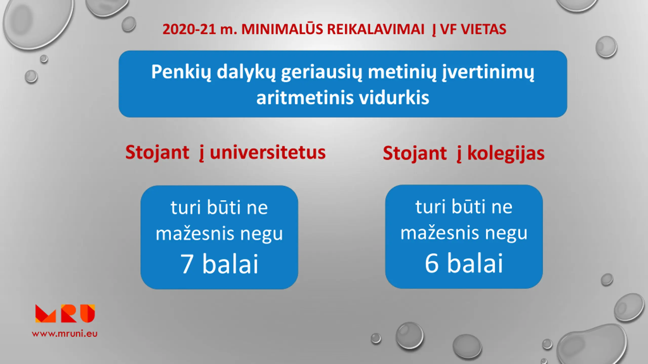 2020-21 m. MINIMALS REIKALAVIMAI VF VIETAS Penki dalyk geriausi metini vertinim aritmetinis vidurkis Stojant universitetus Stojant kolegijas turi b ti ne ma esnis negu 6 balai turi b ti ne ma esnis negu 7 balai www.mruni.eu