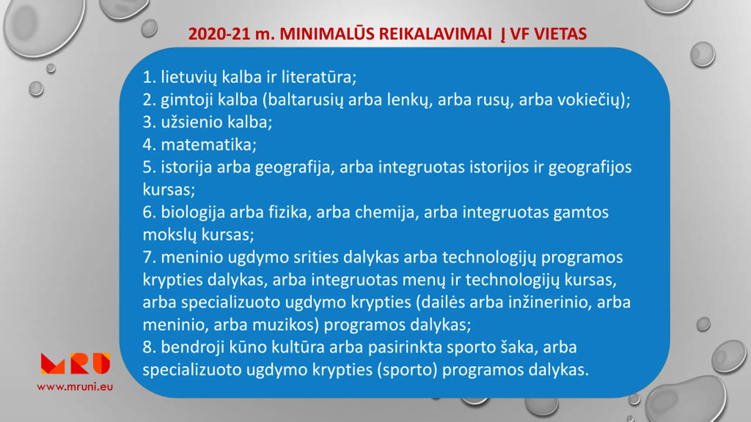 2020-21 m. MINIMALS REIKALAVIMAI VF VIETAS 1. lietuvi kalba ir literat ra; 2. gimtoji kalba (baltarusi arba lenk , arba rus , arba vokie i ); 3. u sienio kalba; 4. matematika; 5. istorija arba geografija, arba integruotas istorijos ir geografijos kursas; 6. biologija arba fizika, arba chemija, arba integruotas gamtos moksl kursas; 7. meninio ugdymo srities dalykas arba technologij programos krypties dalykas, arba integruotas men ir technologij kursas, arba specializuoto ugdymo krypties (dail s arba in inerinio, arba meninio, arba muzikos) programos dalykas; 8. bendroji k no kult ra arba pasirinkta sporto aka, arba specializuoto ugdymo krypties (sporto) programos dalykas. www.mruni.eu