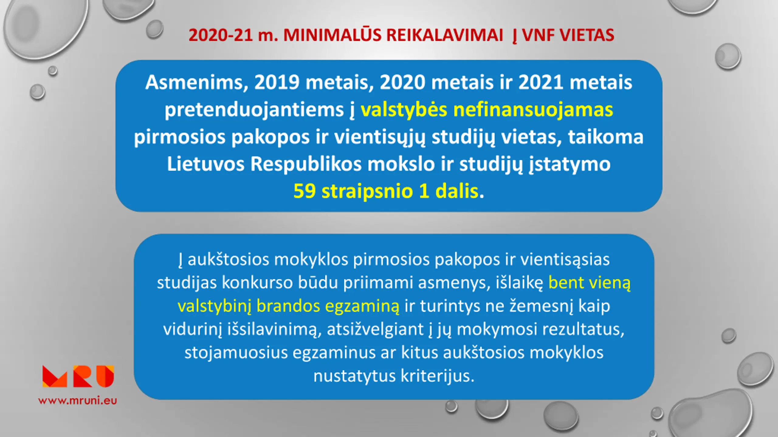 2020-21 m. MINIMALS REIKALAVIMAI VNF VIETAS Asmenims, 2019 metais, 2020 metais ir 2021 metais pretenduojantiems valstyb s nefinansuojamas pirmosios pakopos ir vientis j studij vietas, taikoma Lietuvos Respublikos mokslo ir studij statymo 59 straipsnio 1 dalis. auk tosios mokyklos pirmosios pakopos ir vientis sias studijas konkurso b du priimami asmenys, i laik bent vien valstybin brandos egzamin ir turintys ne emesn kaip vidurin i silavinim , atsi velgiant j mokymosi rezultatus, stojamuosius egzaminus ar kitus auk tosios mokyklos nustatytus kriterijus. www.mruni.eu