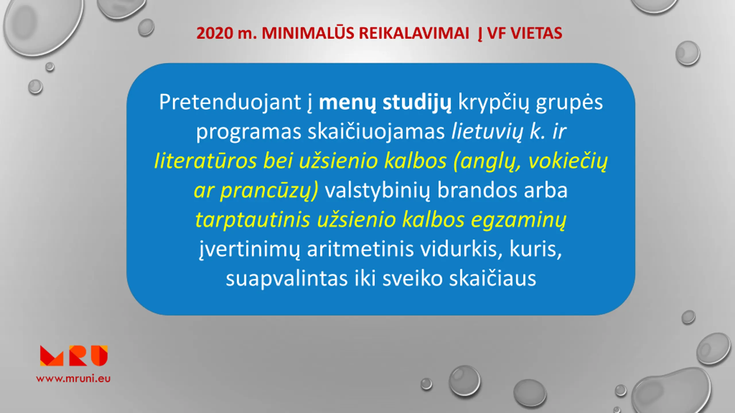 2020 m. MINIMALS REIKALAVIMAI VF VIETAS Pretenduojant men studij kryp i grup s programas skai iuojamas lietuvi k. ir Iiterat ros bei u sienio kalbos (angl , vokie i ar pranc z ) valstybini brandos arba tarptautinis u sienio kalbos egzamin vertinim aritmetinis vidurkis, kuris, suapvalintas iki sveiko skai iaus www.mruni.eu