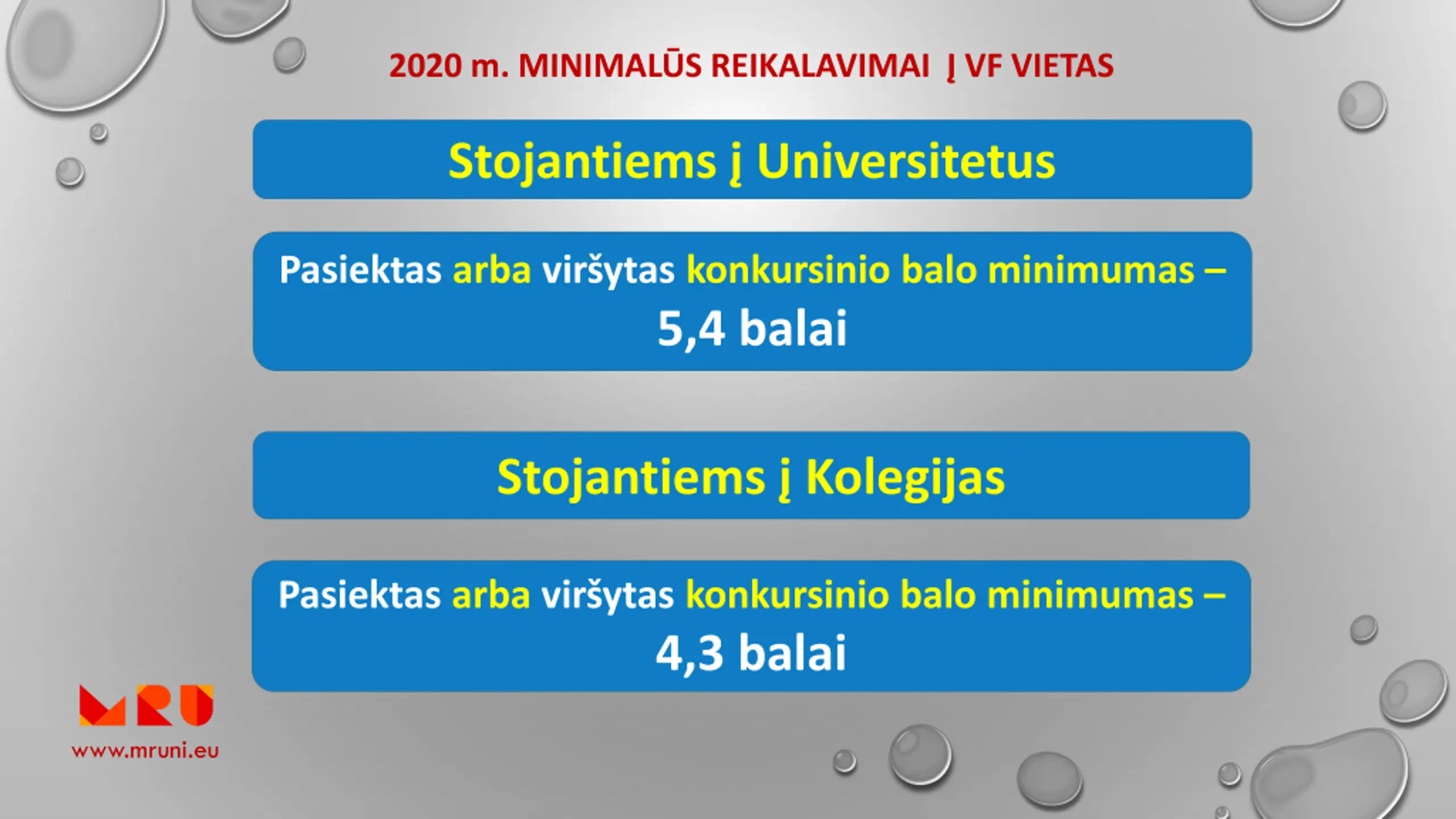 2020 m. MINIMALS REIKALAVIMAI VF VIETAS Stojantiems Universitetus Pasiektas arba vir ytas konkursinio balo minimumas 5,4 balai Stojantiems Kolegijas Pasiektas arba vir ytas konkursinio balo minimumas 4,3 balai www.mruni.eu