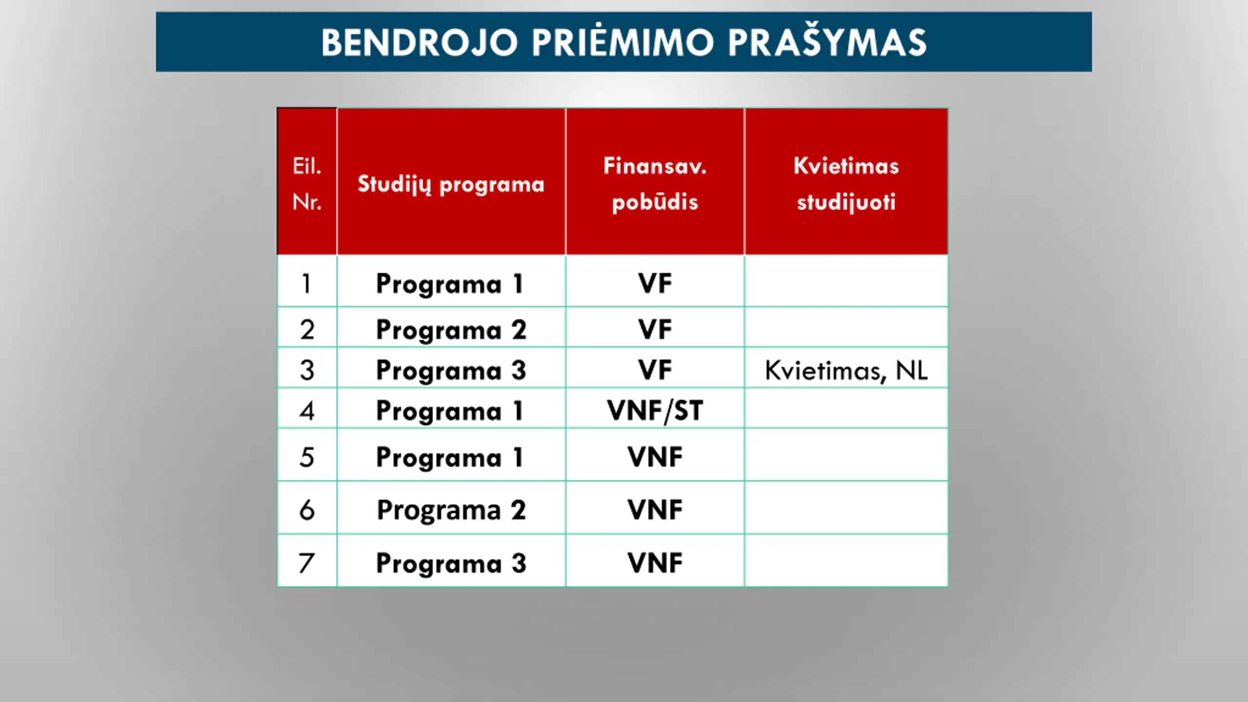 BENDROJO PRIMIMO PRAYMAS Eil. Nr. Finansav. pob dis Kvietimas studijuoti Studij programa 1 2 3 4 5 Programa 1 Programa 2 Programa 3 Programa 1 Programa 1 VF VF VF Kvietimas, NL VNF/ST VNF Programa 2 6 VNF 7 Programa 3 VNF