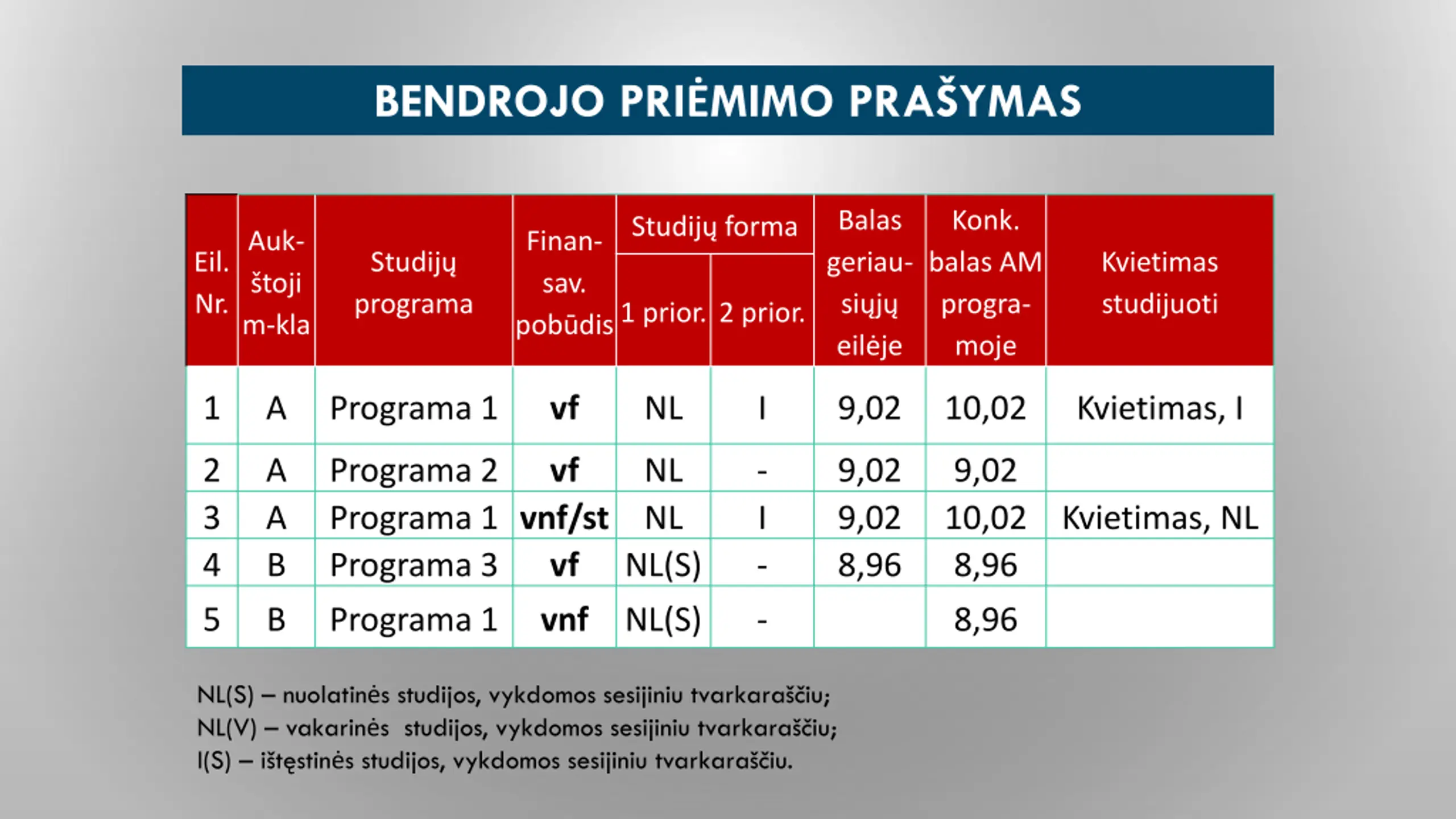 BENDROJO PRIMIMO PRAYMAS Balas geriau- si j eil je Konk. balas AM progra- moje Studij forma Auk- toji m-kla Finan- sav. pob dis Eil. Nr. Studij programa Kvietimas studijuoti 1 prior. 2 prior. 1 A Programa 1 vf NL I 9,02 10,02 Kvietimas, I 2 3 4 5 A A B B Programa 2 Programa 1 vnf/st Programa 3 Programa 1 vf NL NL - I - - 9,02 9,02 8,96 9,02 10,02 8,96 8,96 Kvietimas, NL vf vnf NL(S) NL(S) NL(S) nuolatin s studijos, vykdomos sesijiniu tvarkara iu; NL(V) vakarin s studijos, vykdomos sesijiniu tvarkara iu; I(S) i t stin s studijos, vykdomos sesijiniu tvarkara iu.