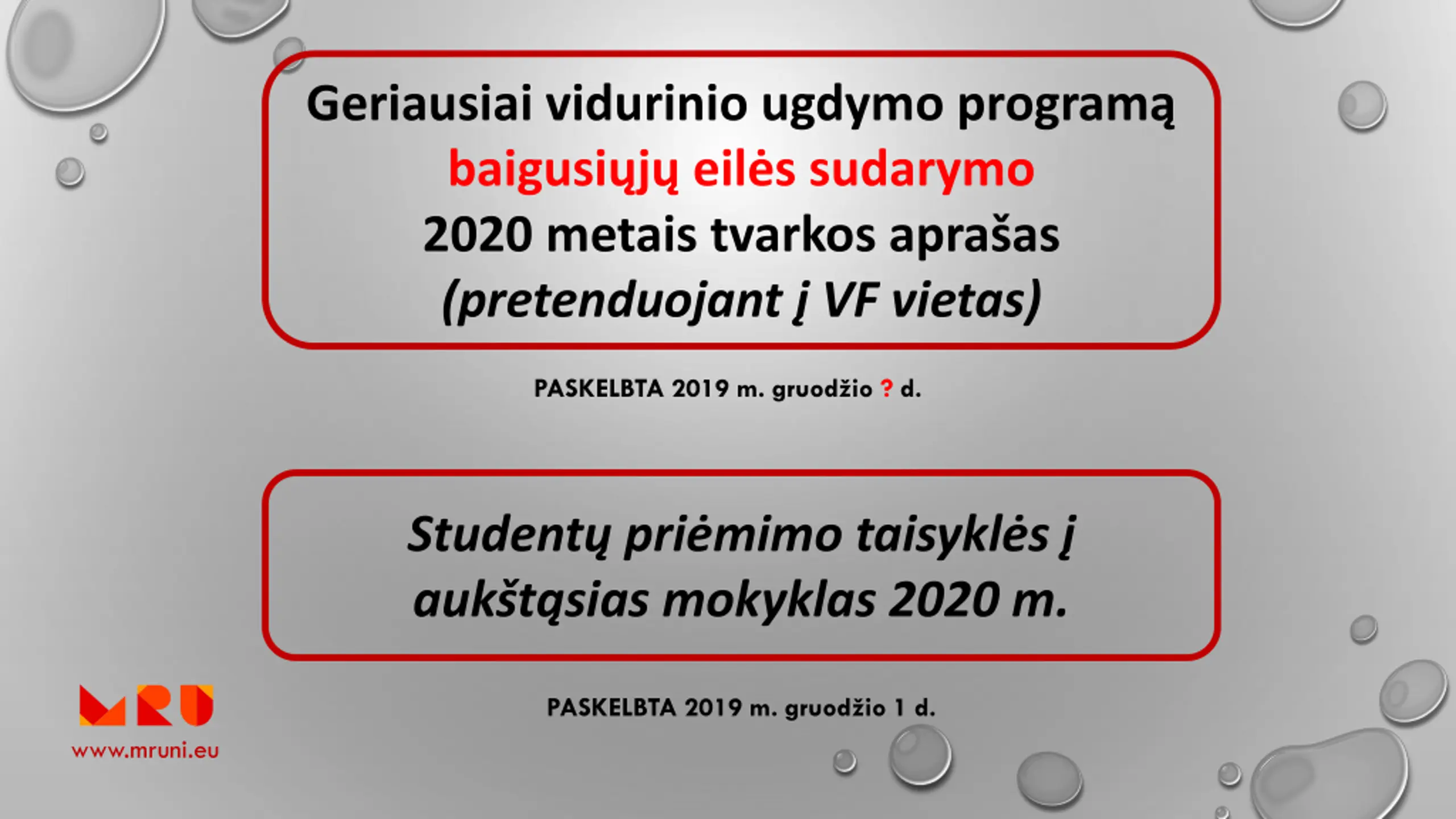 Geriausiai vidurinio ugdymo program baigusi j eil s sudarymo 2020 metais tvarkos apra as (pretenduojant VF vietas) PASKELBTA 2019 m. gruod io ? d. Student pri mimo taisykl s auk t sias mokyklas 2020 m. PASKELBTA 2019 m. gruod io 1 d. www.mruni.eu