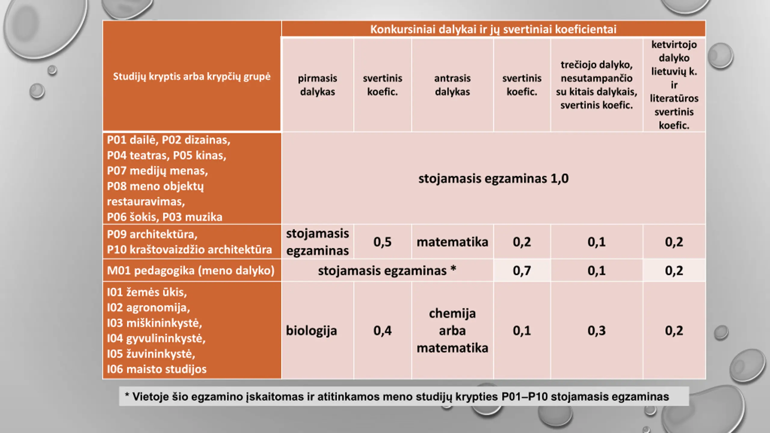 Konkursiniai dalykai ir j svertiniai koeficientai ketvirtojo dalyko lietuvi k. ir literat ros svertinis koefic. tre iojo dalyko, nesutampan io su kitais dalykais, svertinis koefic. Studij kryptis arba kryp i grup pirmasis dalykas svertinis koefic. antrasis dalykas svertinis koefic. P01 dail , P02 dizainas, P04 teatras, P05 kinas, P07 medij menas, P08 meno objekt restauravimas, P06 okis, P03 muzika P09 architekt ra, P10 kra tovaizd io architekt ra stojamasis egzaminas 1,0 stojamasis egzaminas stojamasis egzaminas * 0,5 matematika 0,2 0,1 0,2 0,7 0,1 0,2 M01 pedagogika (meno dalyko) I01 em s kis, I02 agronomija, I03 mi kininkyst , I04 gyvulininkyst , I05 uvininkyst , I06 maisto studijos chemija arba matematika biologija 0,4 0,1 0,3 0,2 * Vietoje io egzamino skaitomas ir atitinkamos meno studij krypties P01 P10 stojamasis egzaminas