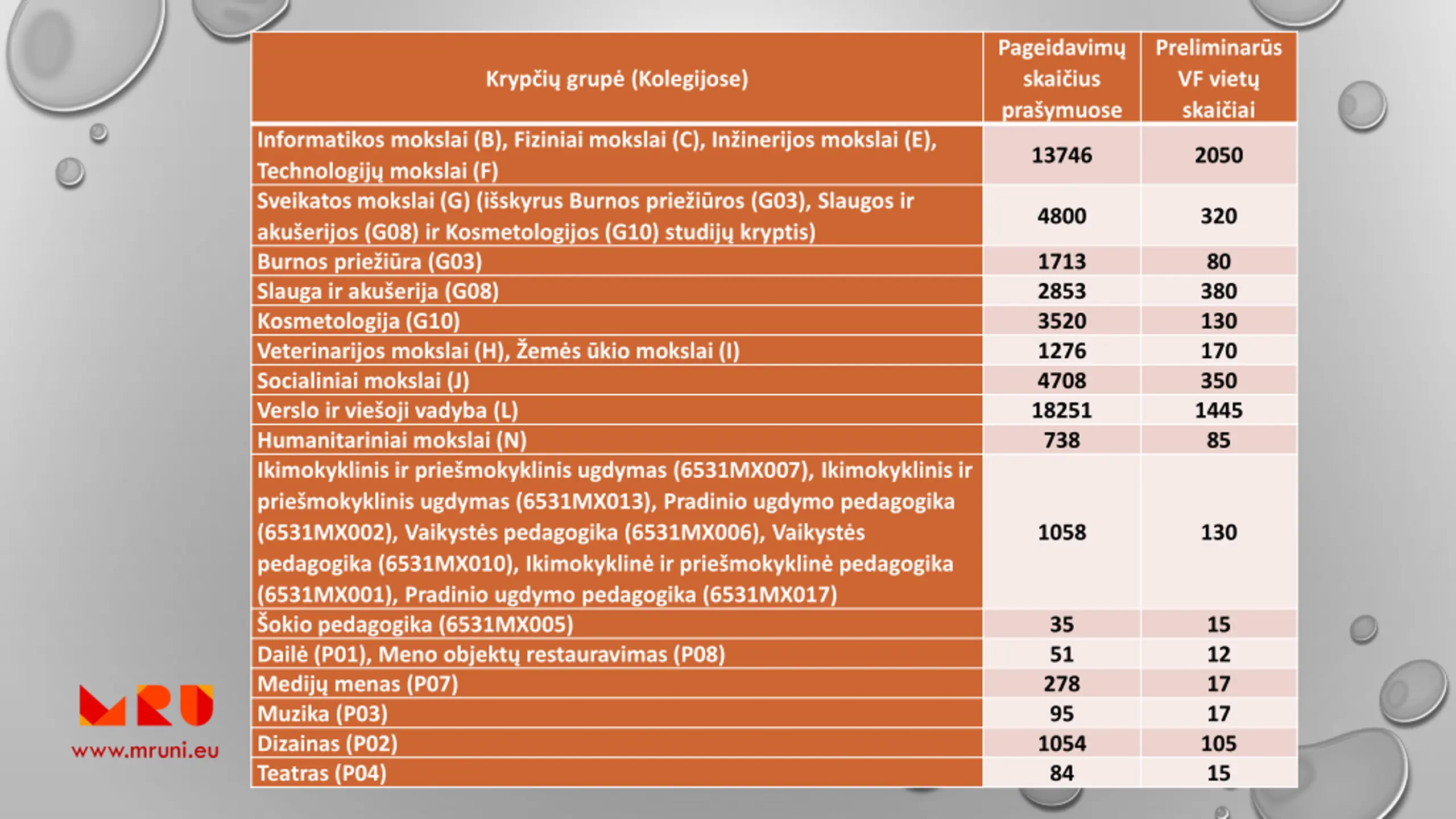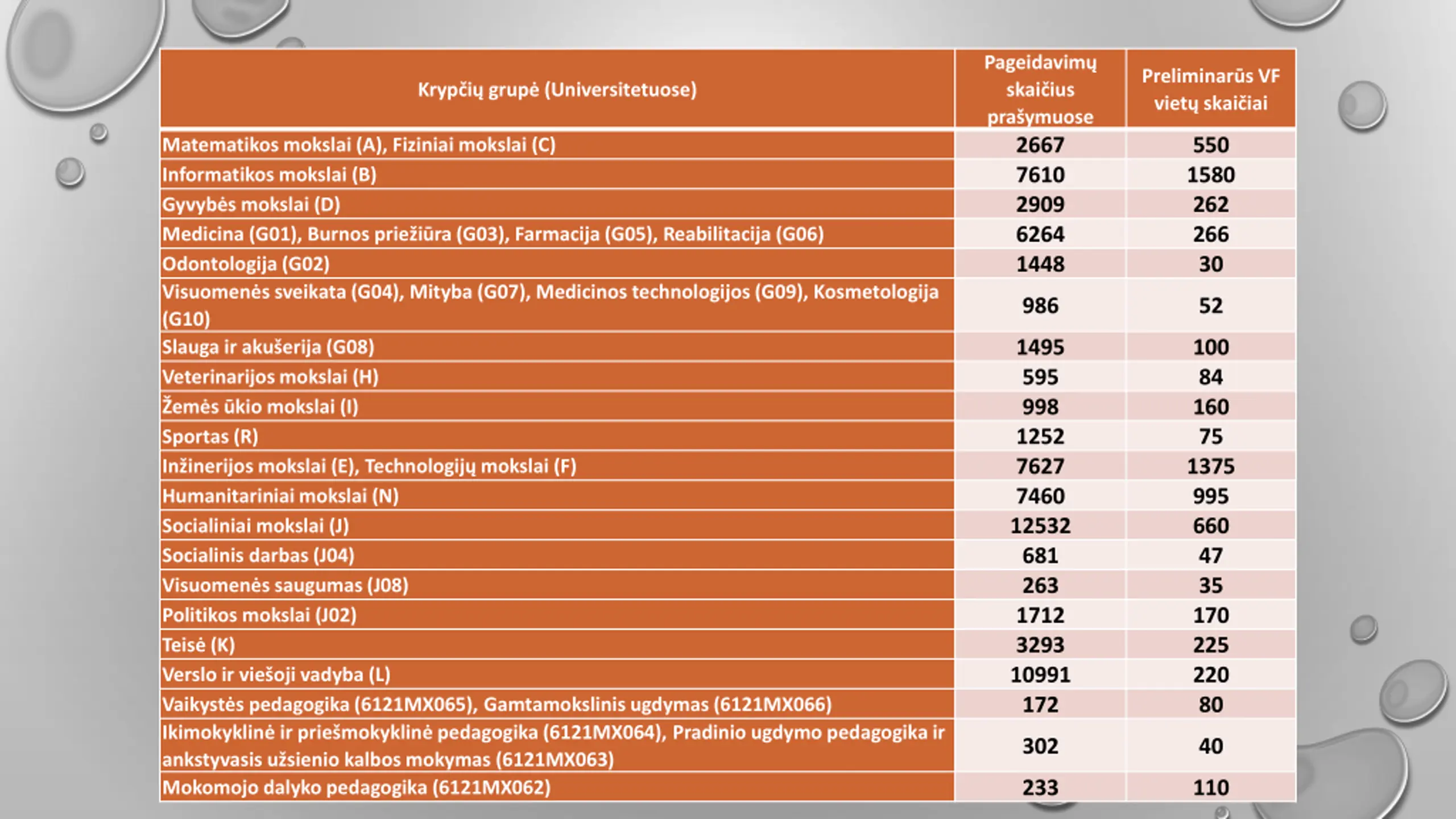 Pageidavim skai ius pra ymuose 2667 7610 2909 6264 1448 Preliminar s VF viet skai iai Kryp i grup (Universitetuose) 550 1580 262 266 30 Matematikos mokslai (A), Fiziniai mokslai (C) Informatikos mokslai (B) Gyvyb s mokslai (D) Medicina (G01), Burnos prie i ra (G03), Farmacija (G05), Reabilitacija (G06) Odontologija (G02) Visuomen s sveikata (G04), Mityba (G07), Medicinos technologijos (G09), Kosmetologija (G10) Slauga ir aku erija (G08) Veterinarijos mokslai (H) em s kio mokslai (I) Sportas (R) In inerijos mokslai (E), Technologij mokslai (F) Humanitariniai mokslai (N) Socialiniai mokslai (J) Socialinis darbas (J04) Visuomen s saugumas (J08) Politikos mokslai (J02) Teis (K) Verslo ir vie oji vadyba (L) Vaikyst s pedagogika(6121MX065), Gamtamokslinis ugdymas (6121MX066) Ikimokyklin ir prie mokyklin pedagogika (6121MX064), Pradinio ugdymo pedagogika ir ankstyvasis u sienio kalbos mokymas (6121MX063) Mokomojo dalyko pedagogika (6121MX062) 986 52 1495 595 998 1252 7627 7460 12532 681 263 1712 3293 10991 172 100 84 160 75 1375 995 660 47 35 170 225 220 80 302 40 233 110
