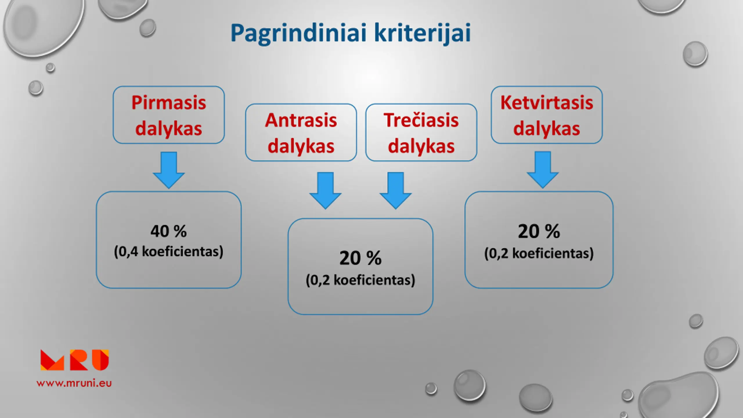 Pagrindiniai kriterijai Pirmasis dalykas Ketvirtasis dalykas Antrasis dalykas Tre iasis dalykas 20 % 40 % (0,4 koeficientas) (0,2 koeficientas) 20 % (0,2 koeficientas) www.mruni.eu