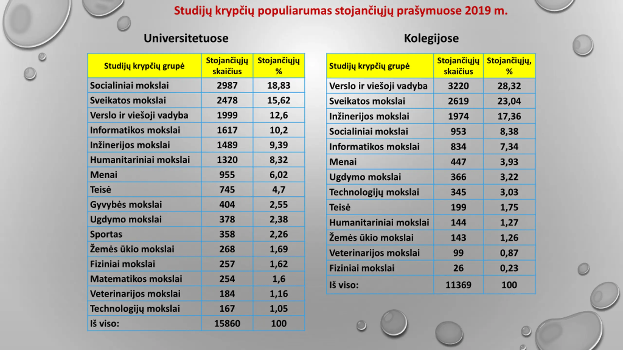 Studij krypi populiarumas stojanij praymuose 2019 m. Universitetuose Kolegijose Stojan i j skai ius 2987 2478 1999 1617 1489 1320 955 745 404 378 358 268 257 254 184 167 15860 Stojan i j % 18,83 15,62 12,6 10,2 9,39 8,32 6,02 4,7 2,55 2,38 2,26 1,69 1,62 1,6 1,16 1,05 100 Stojan i j skai ius 3220 2619 1974 953 834 447 366 345 199 144 143 99 26 Stojan i j , % 28,32 23,04 17,36 8,38 7,34 3,93 3,22 3,03 1,75 1,27 1,26 0,87 0,23 Studij kryp i grup Studij kryp i grup Socialiniai mokslai Sveikatos mokslai Verslo ir vie oji vadyba Informatikos mokslai In inerijos mokslai Humanitariniai mokslai Menai Teis Gyvyb s mokslai Ugdymo mokslai Sportas em s kio mokslai Fiziniai mokslai Matematikos mokslai Veterinarijos mokslai Technologij mokslai I viso: Verslo ir vie oji vadyba Sveikatos mokslai In inerijos mokslai Socialiniai mokslai Informatikos mokslai Menai Ugdymo mokslai Technologij mokslai Teis Humanitariniai mokslai em s kio mokslai Veterinarijos mokslai Fiziniai mokslai I viso: 11369 100