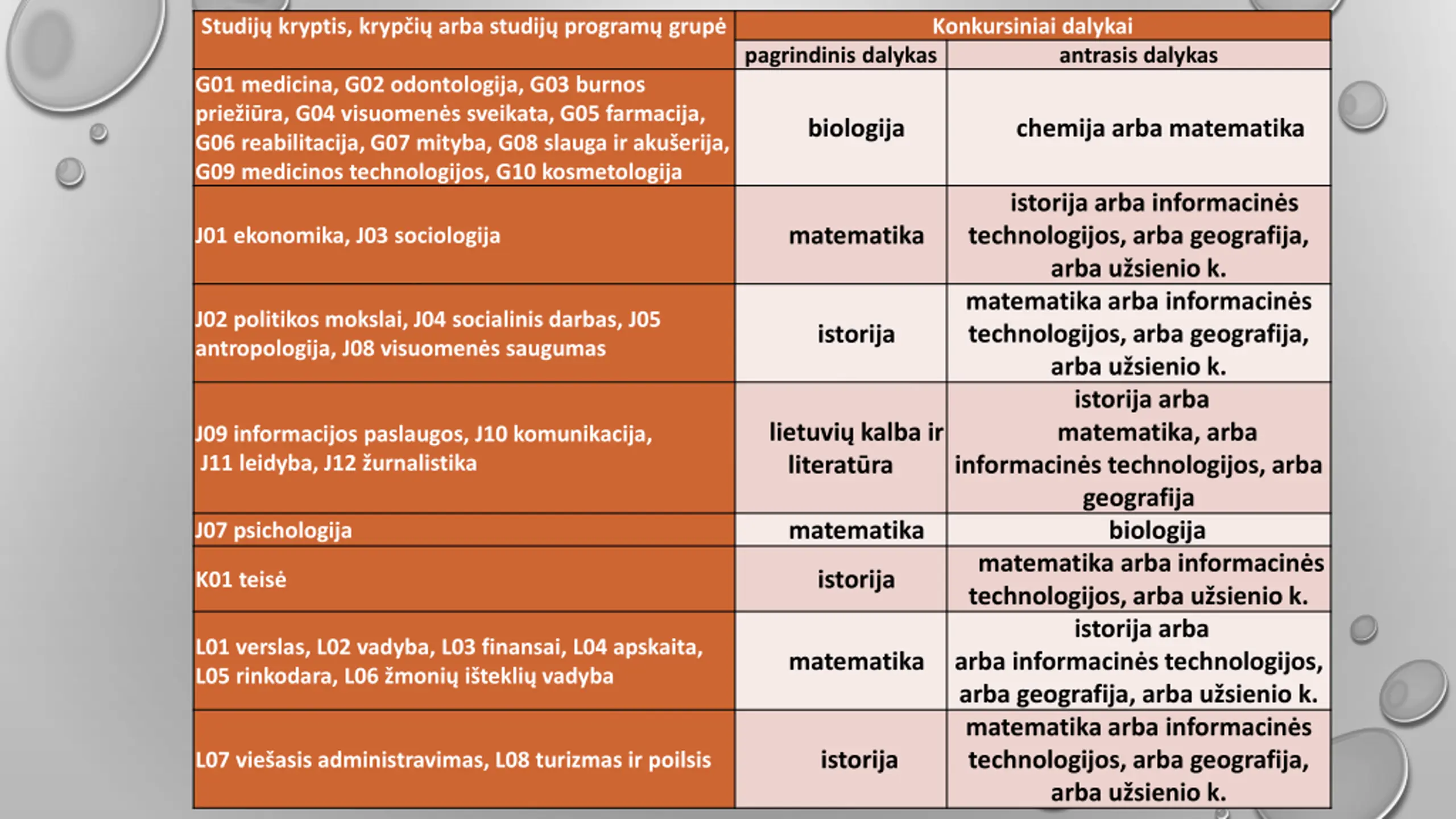 Studij kryptis, krypi arba studij program grup Konkursiniai dalykai pagrindinis dalykas antrasis dalykas G01 medicina, G02 odontologija, G03 burnos prie i ra, G04 visuomen s sveikata, G05 farmacija, G06 reabilitacija, G07 mityba, G08 slauga ir aku erija, G09 medicinos technologijos, G10 kosmetologija biologija chemija arba matematika istorija arba informacin s technologijos, arba geografija, arba u sienio k. matematika arba informacin s technologijos, arba geografija, arba u sienio k. istorija arba matematika, arba informacin s technologijos, arba geografija biologija matematika arba informacin s technologijos, arba u sienio k. istorija arba arba informacin s technologijos, arba geografija, arba u sienio k. matematika arba informacin s technologijos, arba geografija, arba u sienio k. matematika J01 ekonomika, J03 sociologija J02 politikos mokslai, J04 socialinis darbas, J05 antropologija, J08 visuomen s saugumas istorija lietuvi kalba ir literat ra J09 informacijos paslaugos, J10 komunikacija, J11 leidyba, J12 urnalistika matematika J07 psichologija istorija K01 teis L01 verslas, L02 vadyba, L03 finansai, L04 apskaita, L05 rinkodara, L06 moni i tekli vadyba matematika istorija L07 vie asis administravimas, L08 turizmas ir poilsis