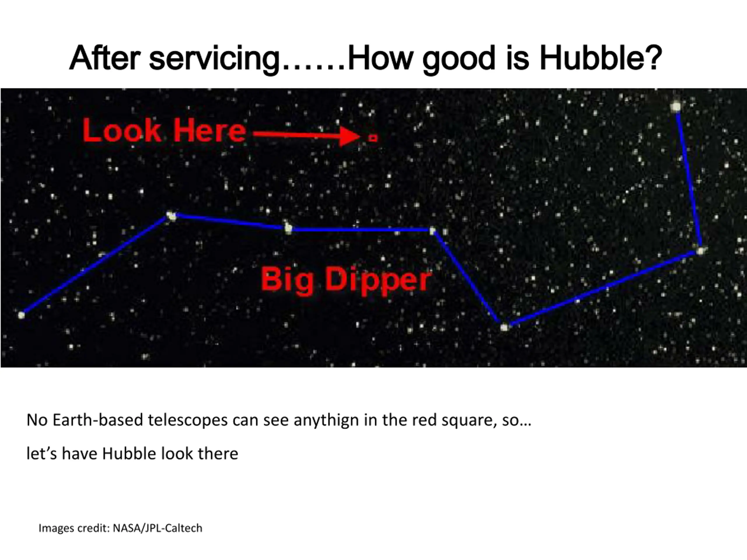 After servicing After servicing How good is Hubble? How good is Hubble? No Earth-based telescopes can see anythign in the red square, so let s have Hubble look there Images credit: NASA/JPL-Caltech