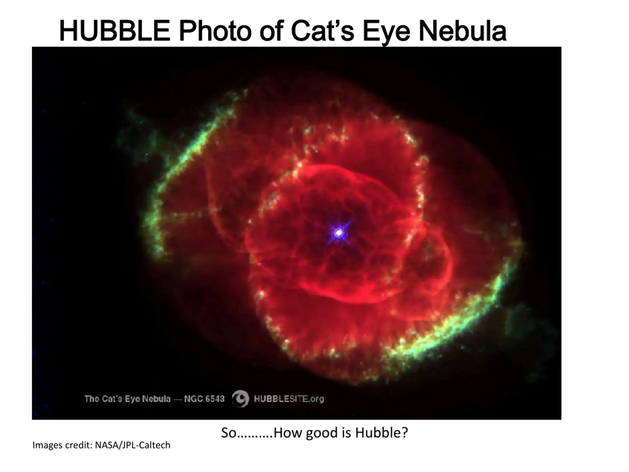 HUBBLE Photo of Cats Eye Nebula HUBBLE Photo of Cat s Eye Nebula So .How good is Hubble? Images credit: NASA/JPL-Caltech