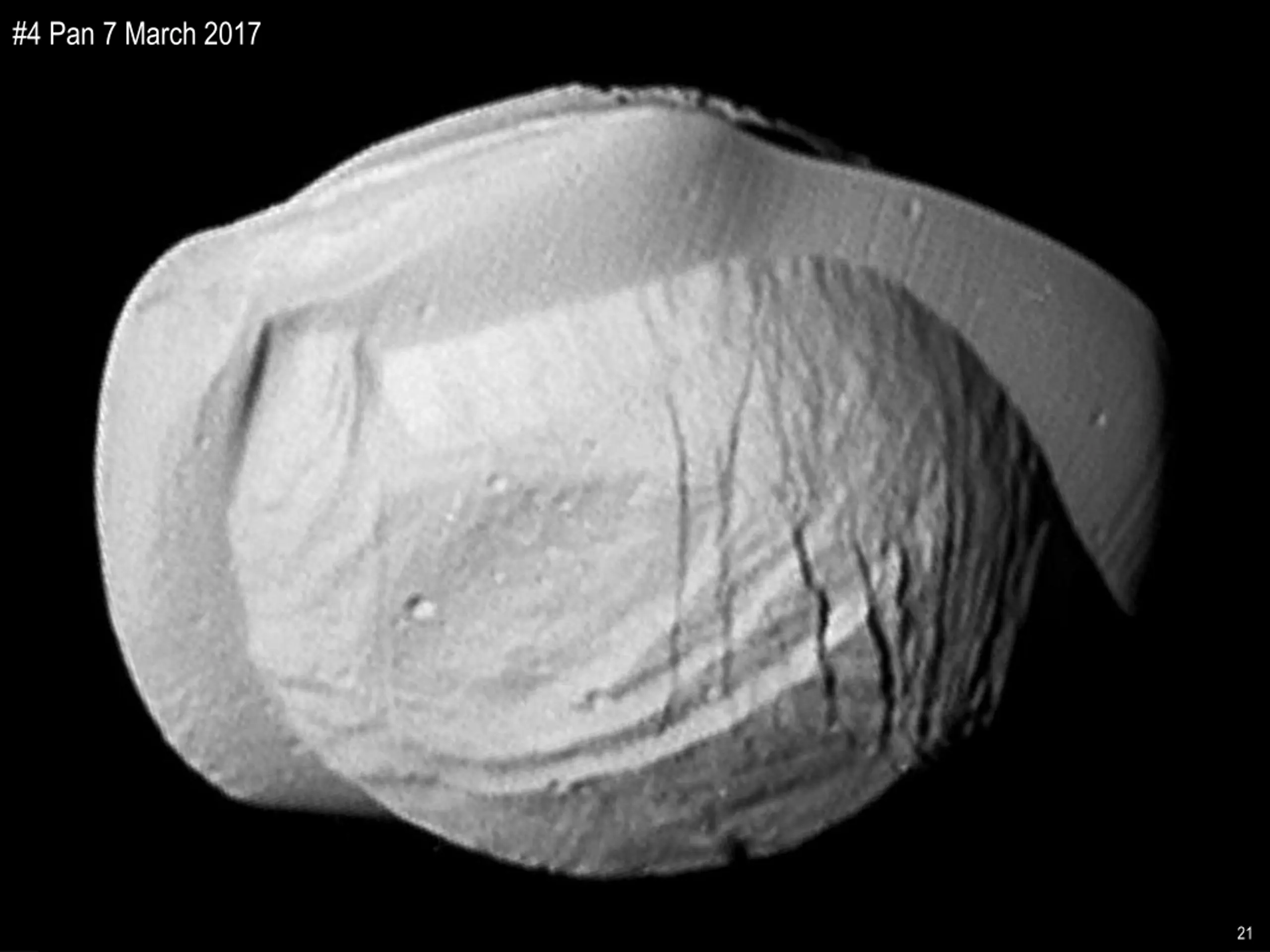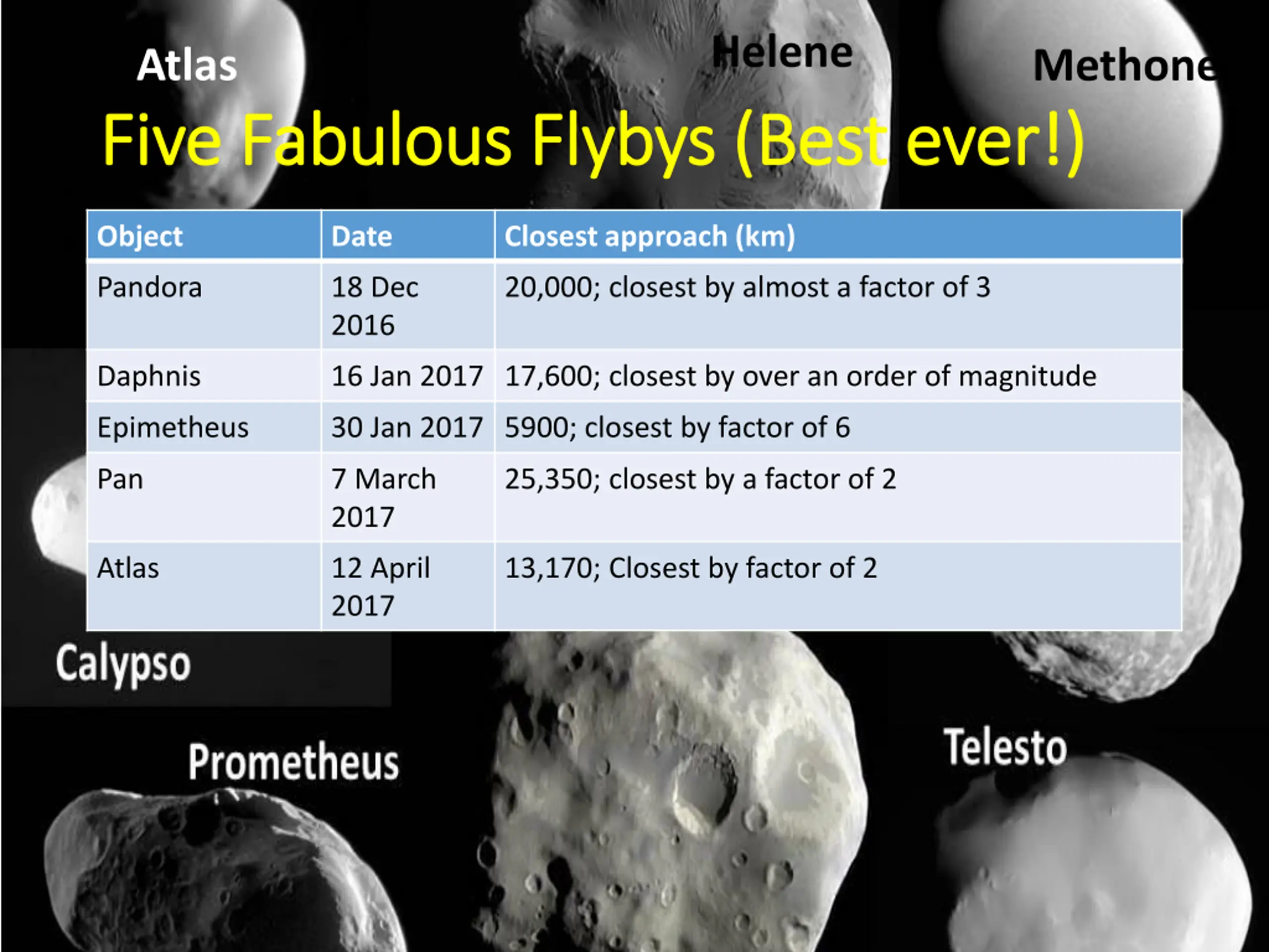 Helene Atlas Methone Five Fabulous Flybys (Best ever!) Five Fabulous Flybys (Best ever!) Object Date Closest approach (km) Pandora 18 Dec 2016 20,000; closest by almost a factor of 3 Daphnis 16 Jan 2017 17,600; closest by over an order of magnitude Epimetheus 30 Jan 2017 5900; closest by factor of 6 Pan 7 March 2017 25,350; closest by a factor of 2 Atlas 12 April 2017 13,170; Closest by factor of 2