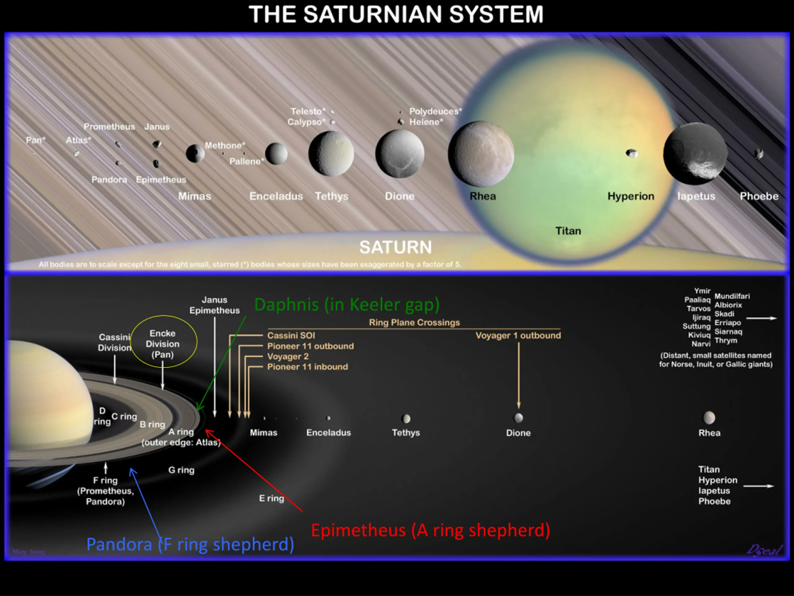 Daphnis (in Keeler gap) Epimetheus (A ring shepherd) Pandora (F ring shepherd)