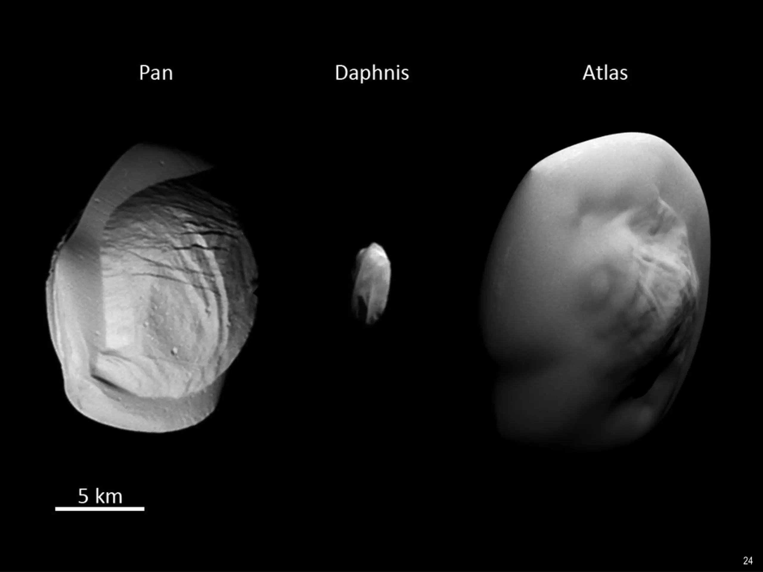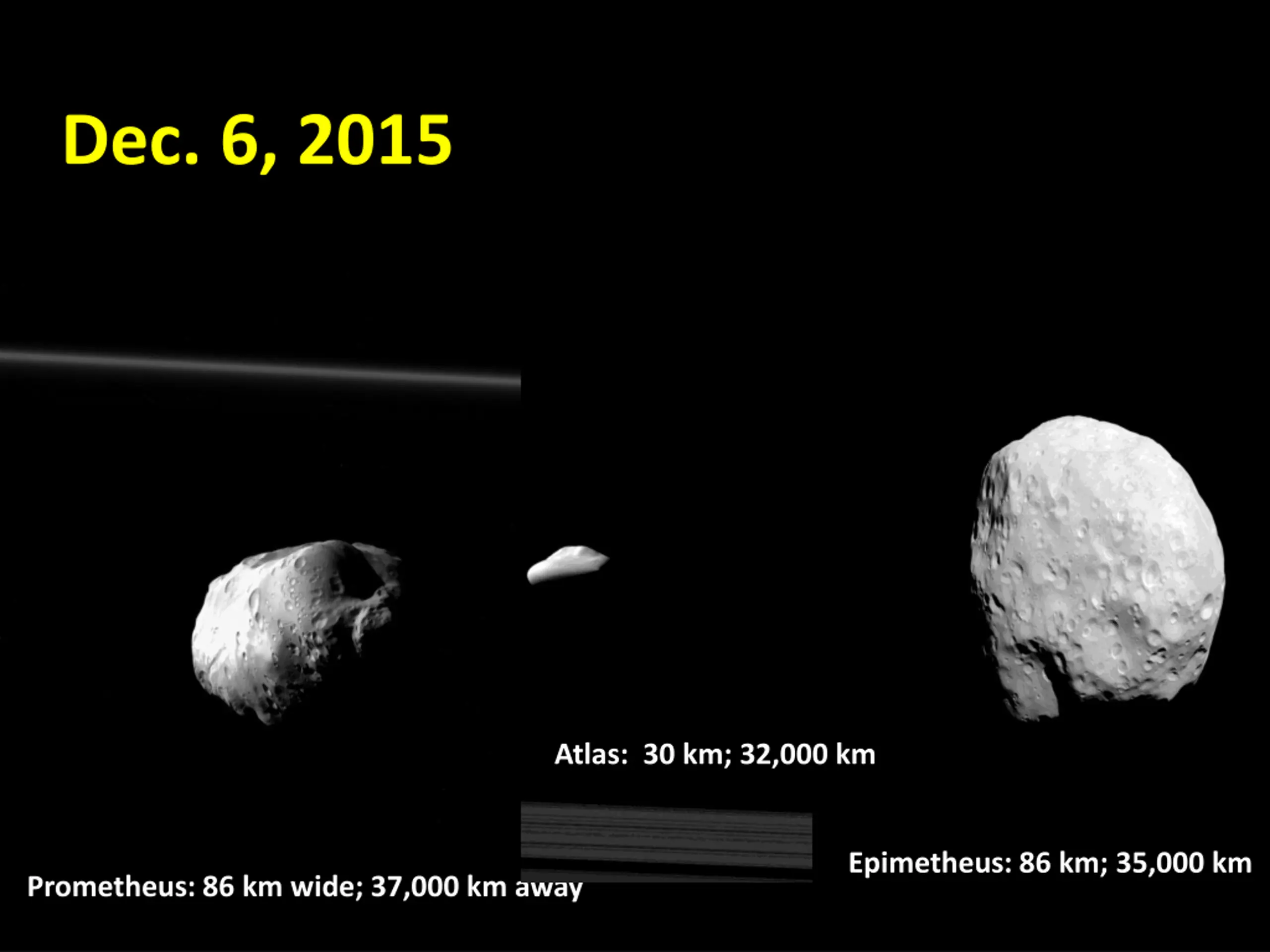Dec. 6, 2015 Atlas: 30 km; 32,000 km Epimetheus: 86 km; 35,000 km Prometheus: 86 km wide; 37,000 km away