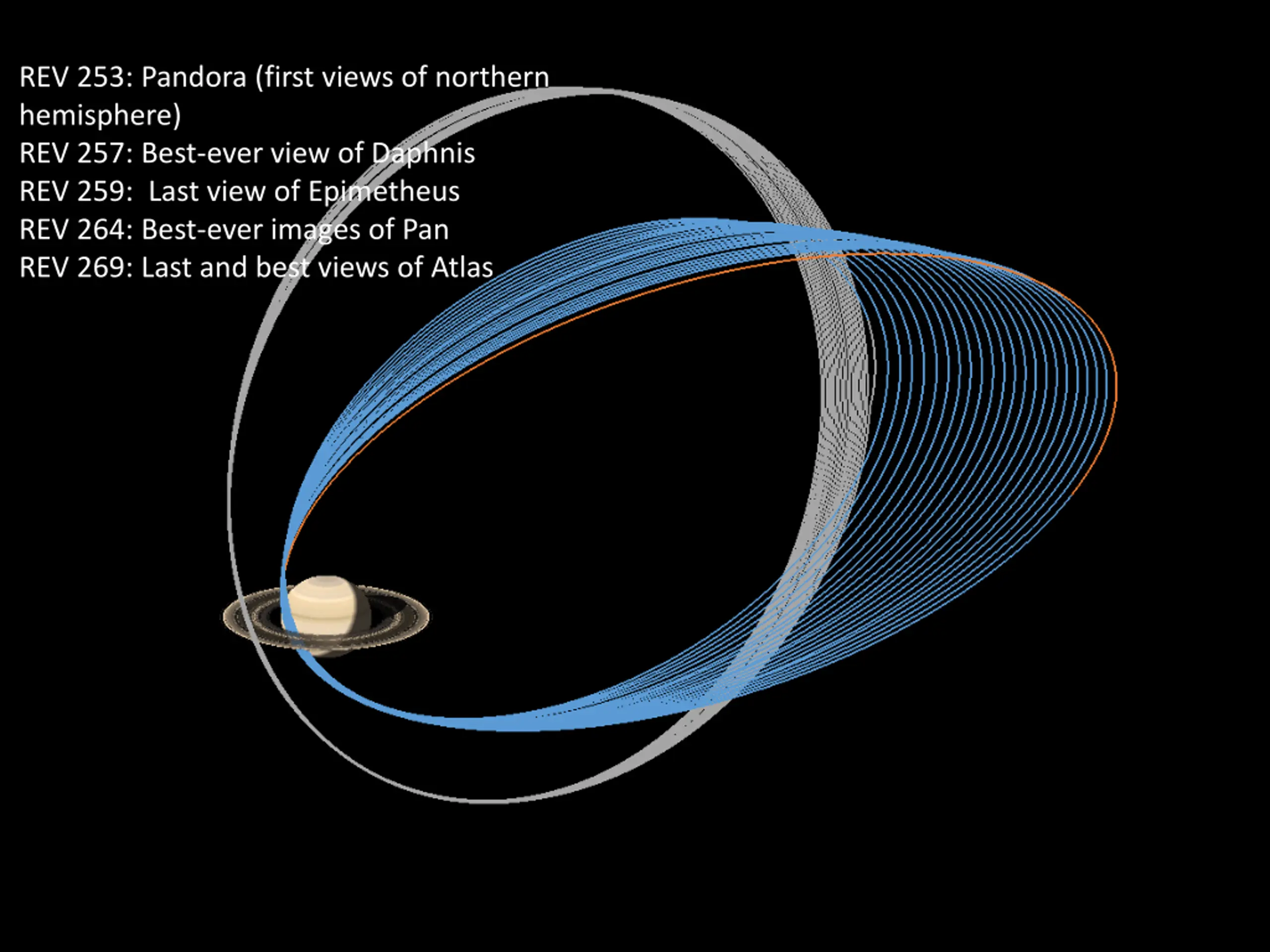 REV 253: Pandora (first views of northern hemisphere) REV 257: Best-ever view of Daphnis REV 259: Last view of Epimetheus REV 264: Best-ever images of Pan REV 269: Last and best views of Atlas