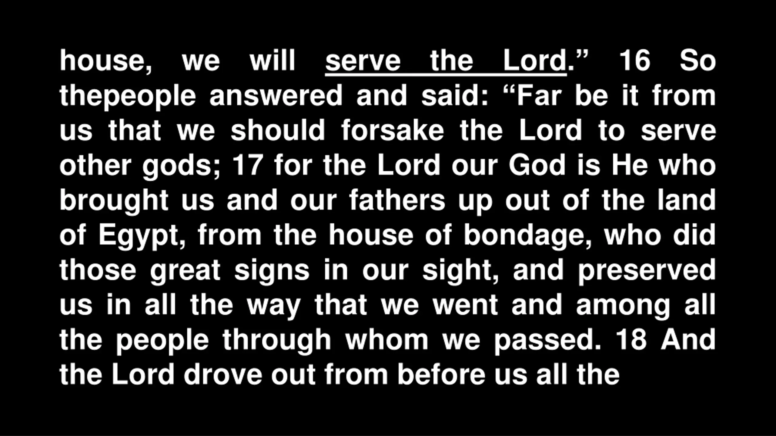 house, we will serve the Lord. 16 So thepeople answered and said: Far be it from us that we should forsake the Lord to serve other gods; 17 for the Lord our God is He who brought us and our fathers up out of the land of Egypt, from the house of bondage, who did those great signs in our sight, and preserved us in all the way that we went and among all the people through whom we passed. 18 And the Lord drove out from before us all the