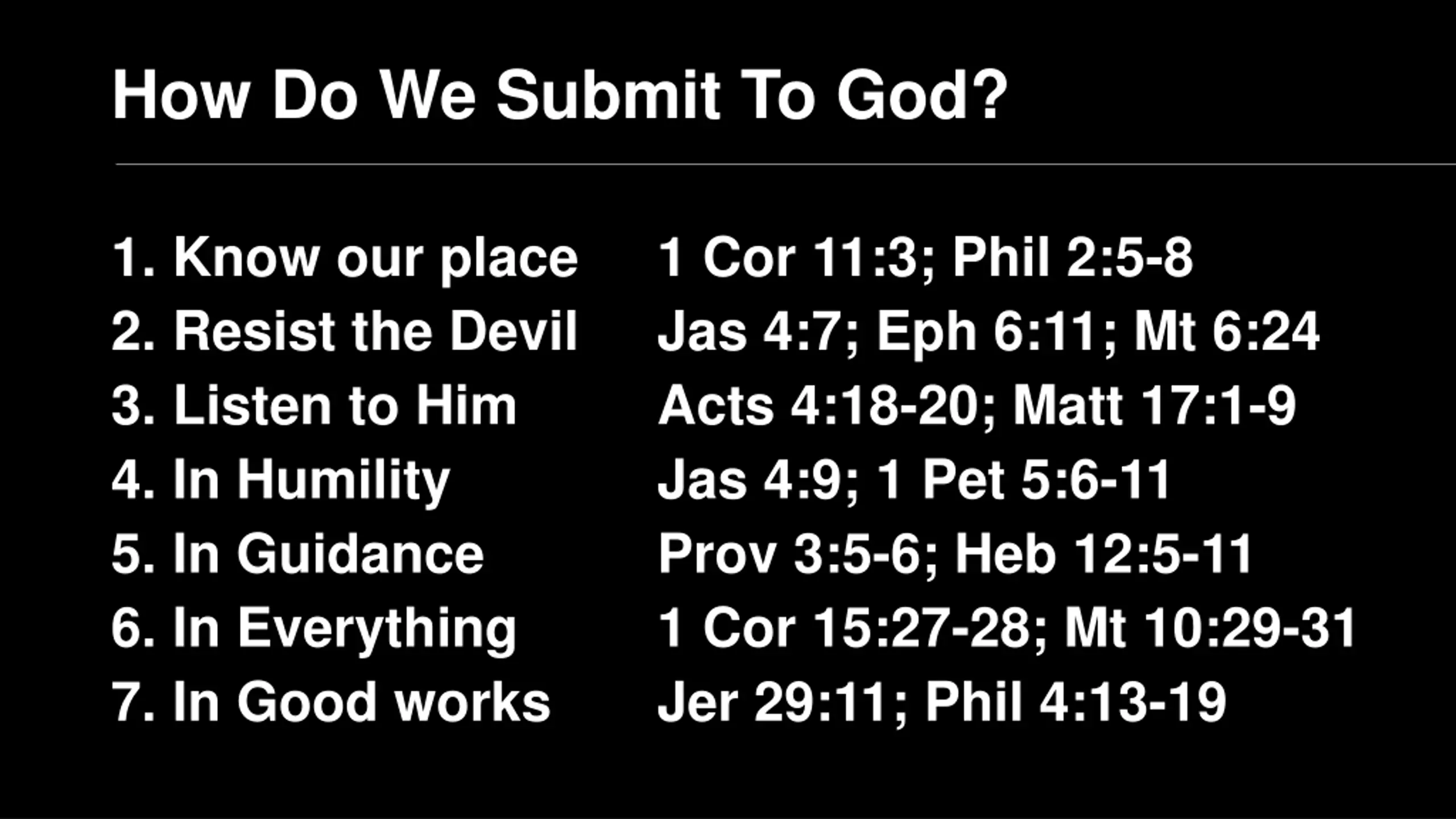 How Do We Submit To God? 1. Know our place 2. Resist the Devil 3. Listen to Him 4. In Humility 5. In Guidance 6. In Everything 7. In Good works 1 Cor 11:3; Phil 2:5-8 Jas 4:7; Eph 6:11; Mt 6:24 Acts 4:18-20; Matt 17:1-9 Jas 4:9; 1 Pet 5:6-11 Prov 3:5-6; Heb 12:5-11 1 Cor 15:27-28; Mt 10:29-31 Jer 29:11; Phil 4:13-19