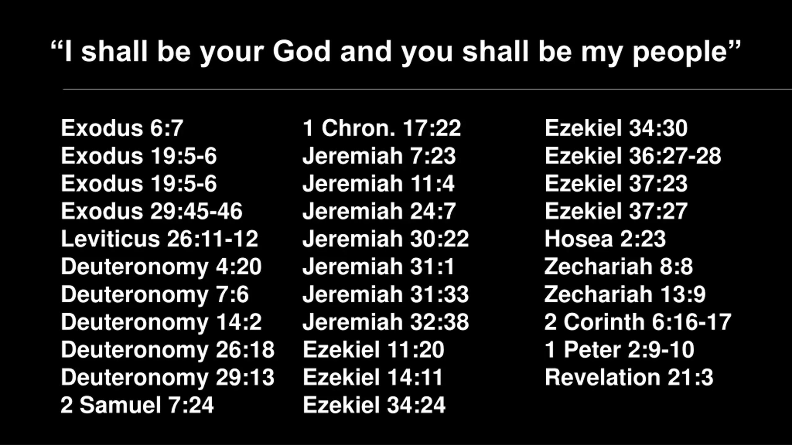 I shall be your God and you shall be my people Exodus 6:7 Exodus 19:5-6 Exodus 19:5-6 Exodus 29:45-46 Leviticus 26:11-12 Deuteronomy 4:20 Deuteronomy 7:6 Deuteronomy 14:2 Deuteronomy 26:18 Deuteronomy 29:13 2 Samuel 7:24 1 Chron. 17:22 Jeremiah 7:23 Jeremiah 11:4 Jeremiah 24:7 Jeremiah 30:22 Jeremiah 31:1 Jeremiah 31:33 Jeremiah 32:38 Ezekiel 11:20 Ezekiel 14:11 Ezekiel 34:24 Ezekiel 34:30 Ezekiel 36:27-28 Ezekiel 37:23 Ezekiel 37:27 Hosea 2:23 Zechariah 8:8 Zechariah 13:9 2 Corinth 6:16-17 1 Peter 2:9-10 Revelation 21:3