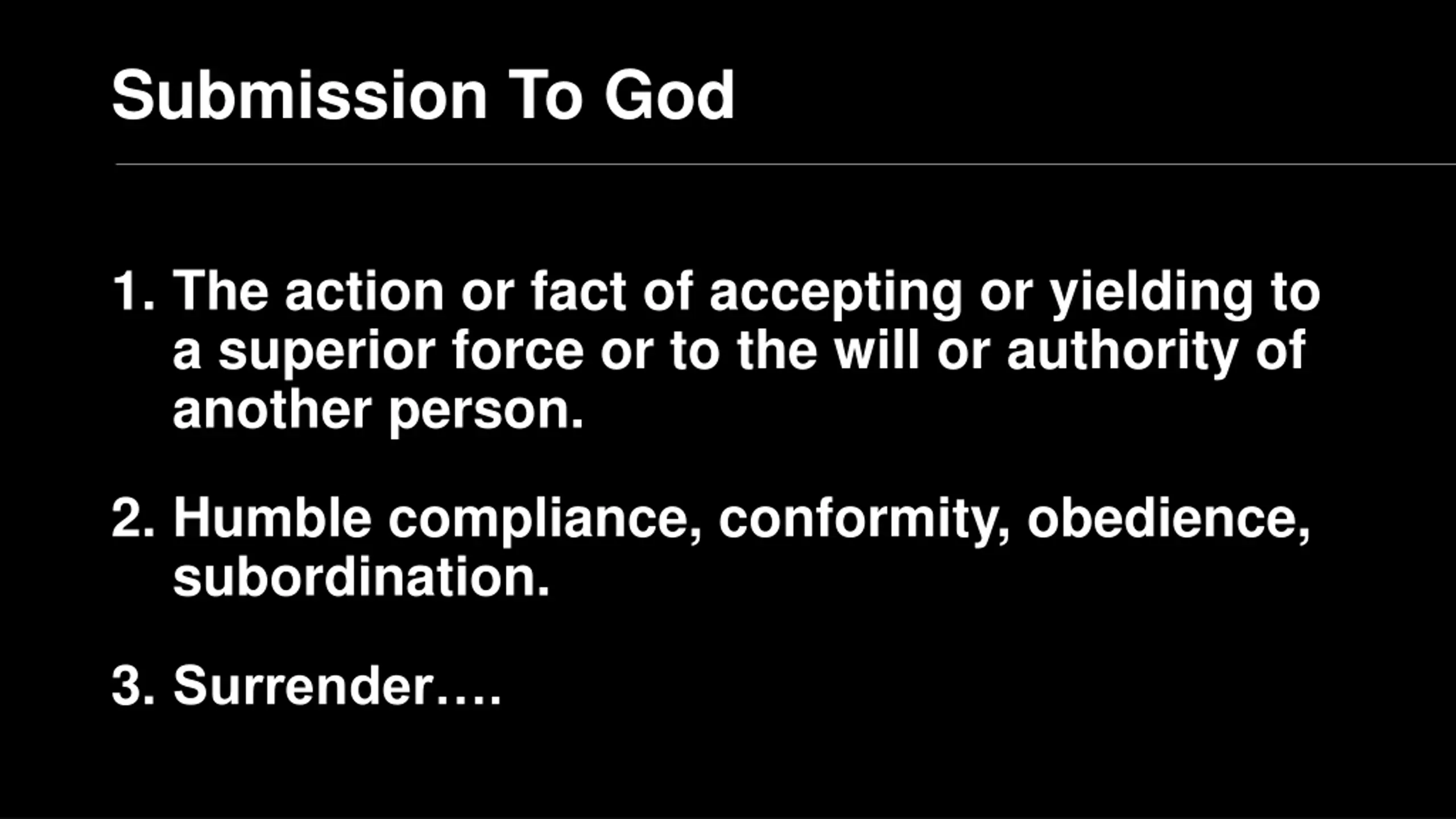Submission To God 1. The action or fact of accepting or yielding to a superior force or to the will or authority of another person. 2. Humble compliance, conformity, obedience, subordination. 3. Surrender .