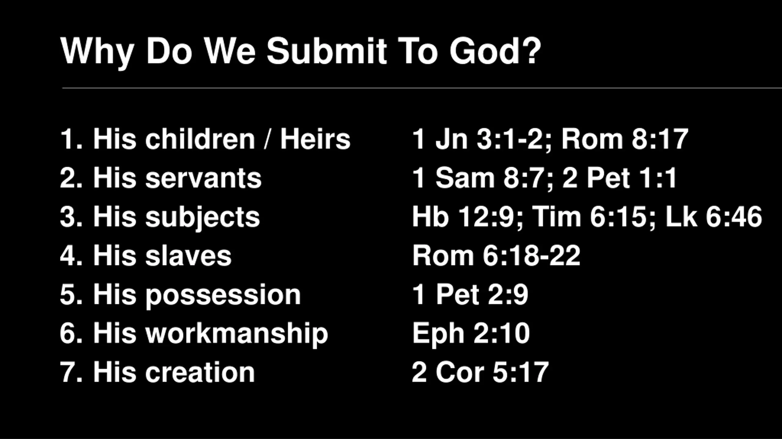 Why Do We Submit To God? 1. His children / Heirs 2. His servants 3. His subjects 4. His slaves 5. His possession 6. His workmanship 7. His creation 1 Jn 3:1-2; Rom 8:17 1 Sam 8:7; 2 Pet 1:1 Hb 12:9; Tim 6:15; Lk 6:46 Rom 6:18-22 1 Pet 2:9 Eph 2:10 2 Cor 5:17