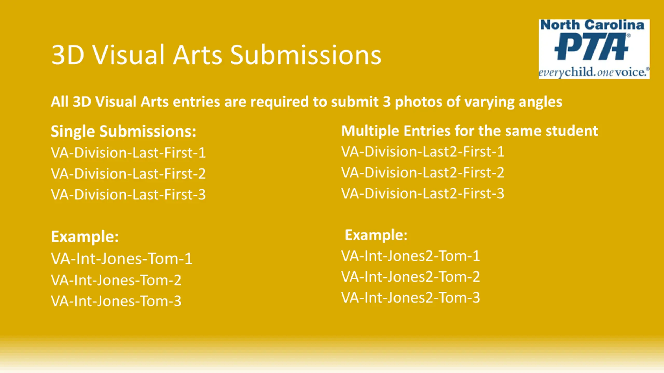 3D Visual Arts Submissions All 3D Visual Arts entries are required to submit 3 photos of varying angles Single Submissions: VA-Division-Last-First-1 VA-Division-Last-First-2 VA-Division-Last-First-3 Multiple Entries for the same student VA-Division-Last2-First-1 VA-Division-Last2-First-2 VA-Division-Last2-First-3 Example: VA-Int-Jones2-Tom-1 VA-Int-Jones2-Tom-2 VA-Int-Jones2-Tom-3 Example: VA-Int-Jones-Tom-1 VA-Int-Jones-Tom-2 VA-Int-Jones-Tom-3