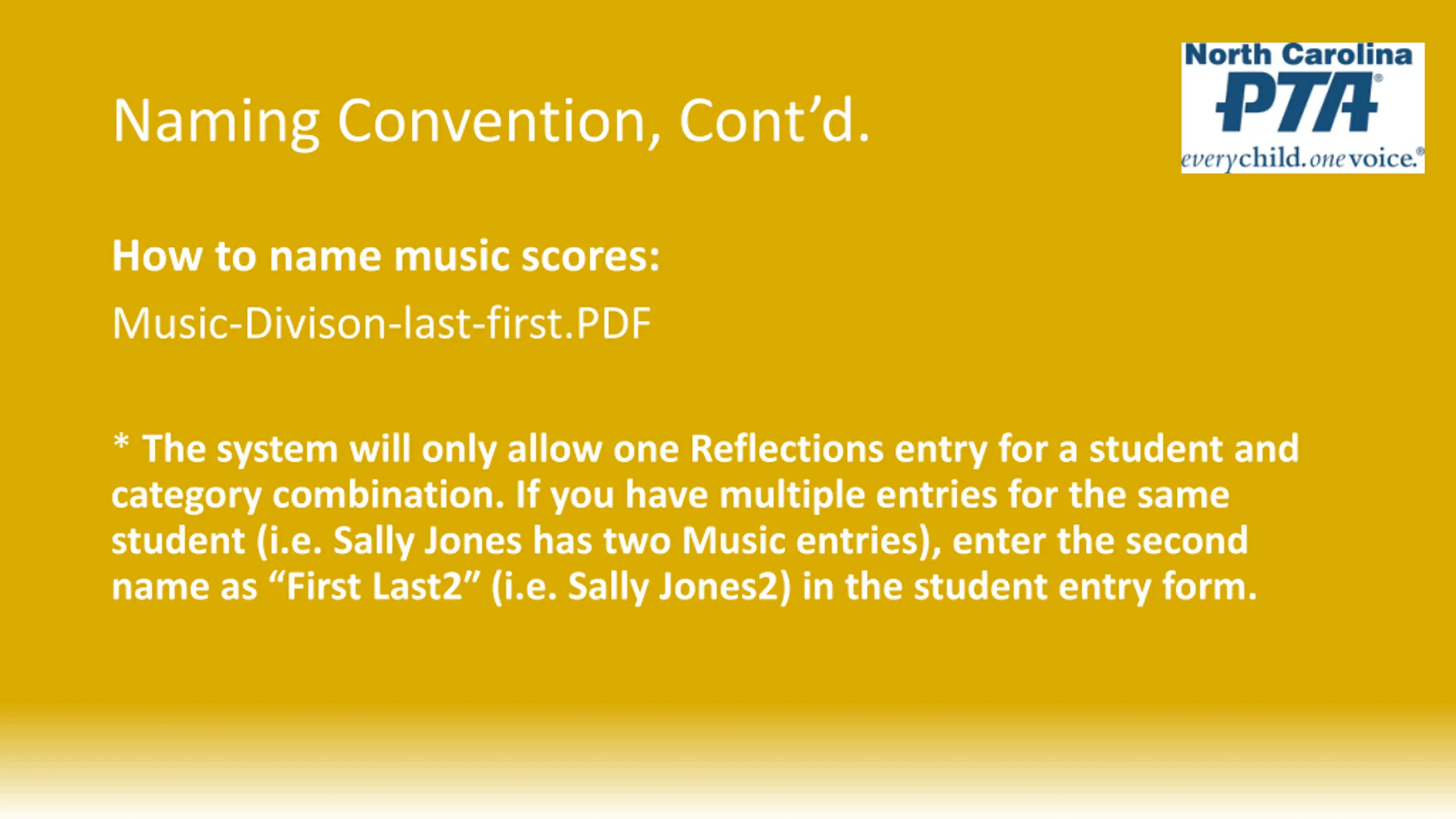Naming Convention, Contd. How to name music scores: Music-Divison-last-first.PDF * The system will only allow one Reflections entry for a student and category combination. If you have multiple entries for the same student (i.e. Sally Jones has two Music entries), enter the second name as First Last2 (i.e. Sally Jones2) in the student entry form.