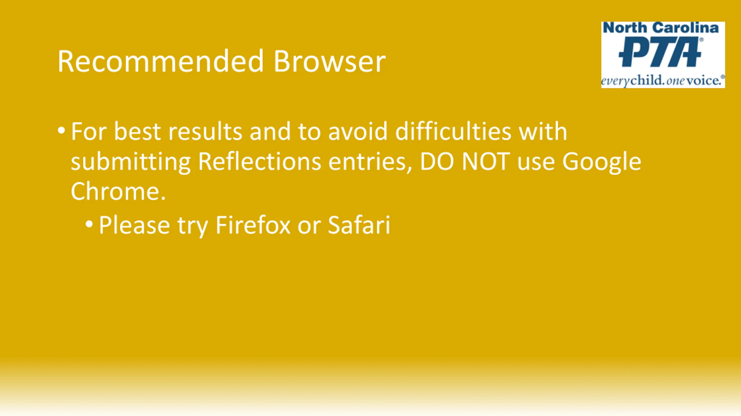 Recommended Browser For best results and to avoid difficulties with submitting Reflections entries, DO NOT use Google Chrome. Please try Firefox or Safari