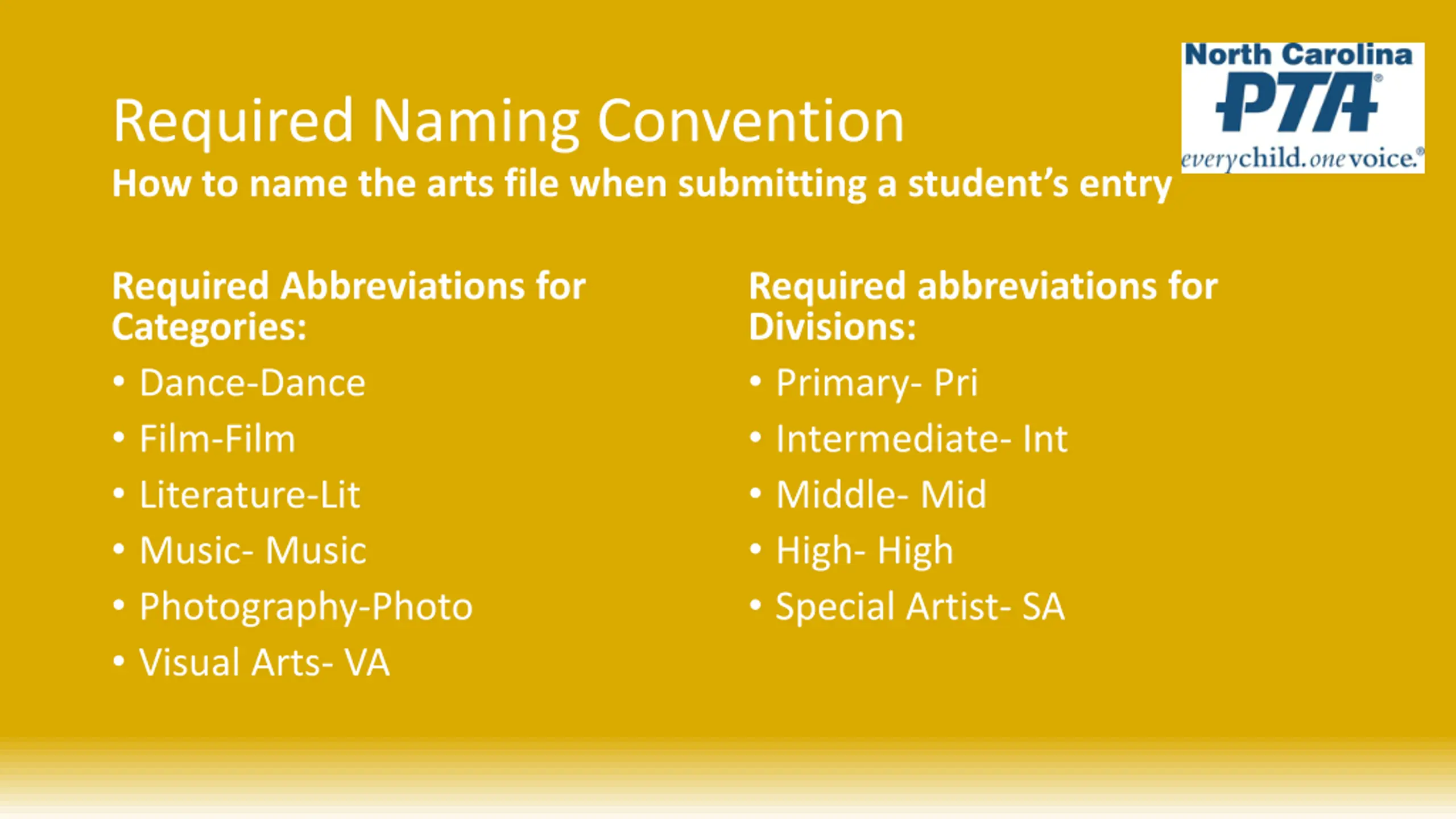 Required Naming Convention How to name the arts file when submitting a student s entry Required Abbreviations for Categories: Dance-Dance Film-Film Literature-Lit Music- Music Photography-Photo Visual Arts- VA Required abbreviations for Divisions: Primary- Pri Intermediate- Int Middle- Mid High- High Special Artist- SA