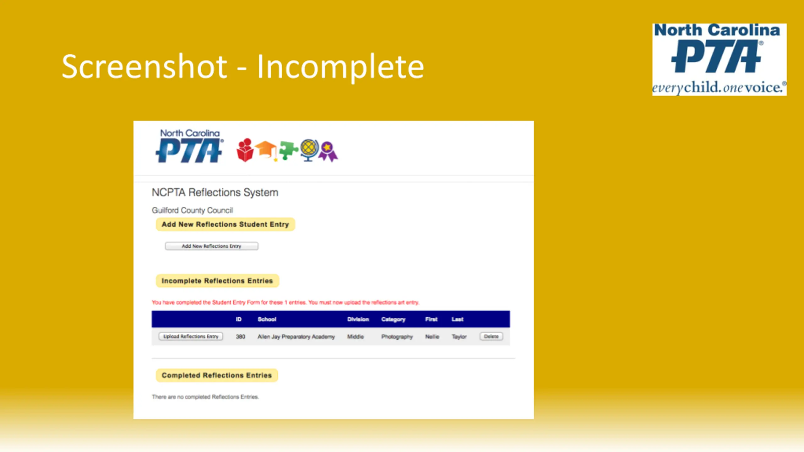 Review Entries for Accuracy Once you have entered the Student Entry Form and uploaded the Art File, the student will be listed under Completed Reflections Entries The entries in this list have been submitted to NCPTA and no further action is needed The Submission Process is not complete until both the Student Entry Form is entered and the Art File is uploaded Option to Delete a Submission Once the Student Entry Form is entered and the Student Art File is uploaded, modifications can not be made but the user can delete the entry and start over