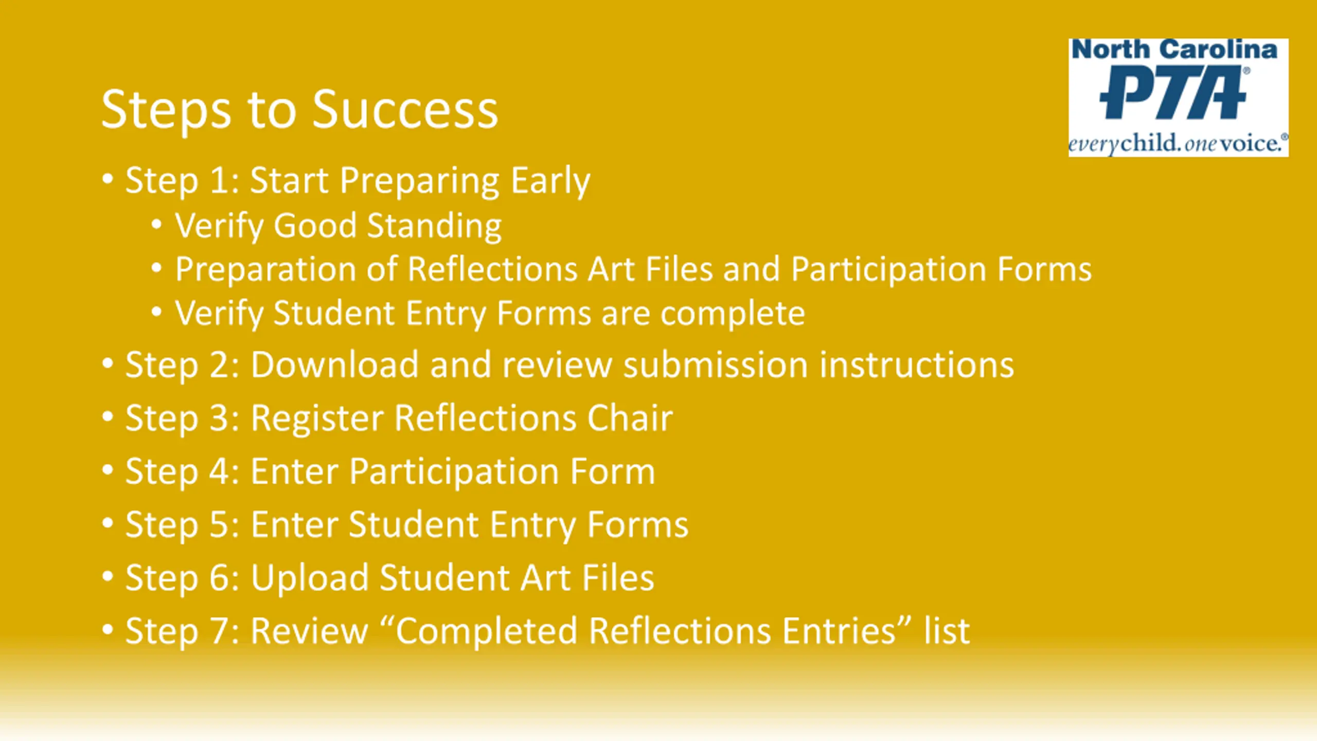 Steps to Success Step 1: Start Preparing Early Verify Good Standing Preparation of Reflections Art Files and Participation Forms Verify Student Entry Forms are complete Step 2: Download and review submission instructions Step 3: Register Reflections Chair Step 4: Enter Participation Form Step 5: Enter Student Entry Forms Step 6: Upload Student Art Files Step 7: Review Completed Reflections Entries list