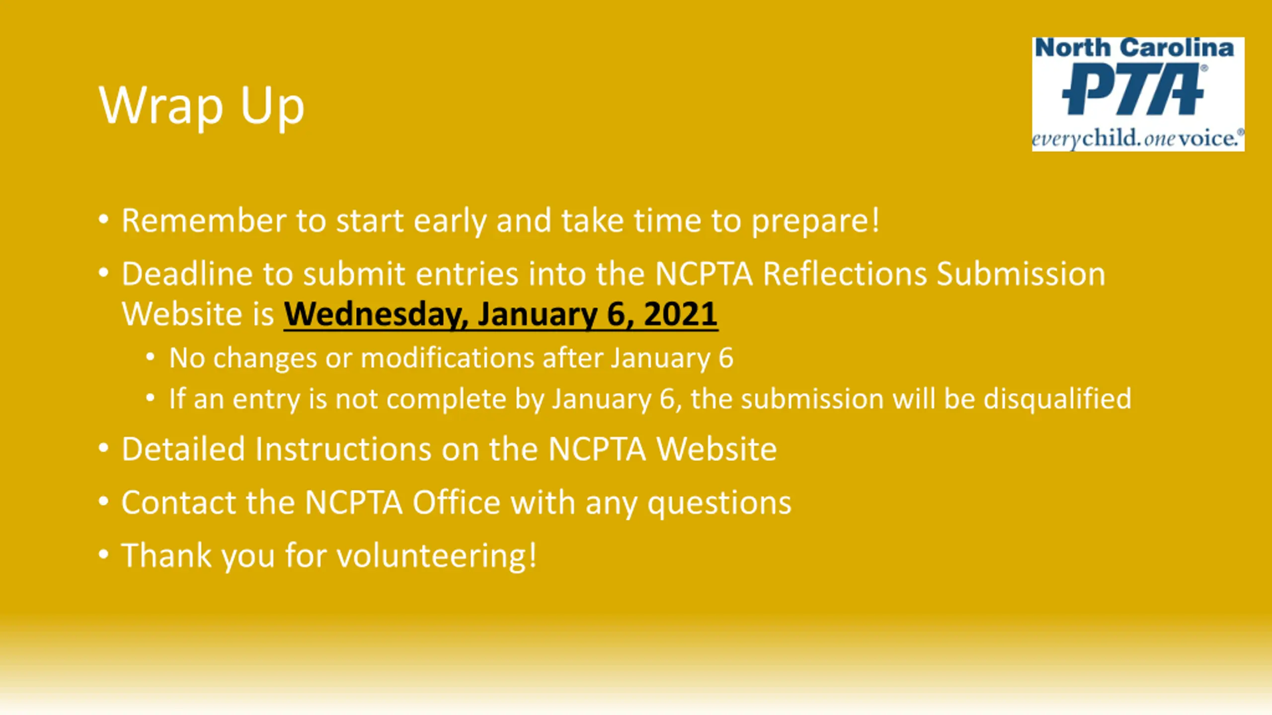 Wrap Up Remember to start early and take time to prepare! Deadline to submit entries into the NCPTA Reflections Submission Website is Wednesday, January 6, 2021 No changes or modifications after January 6 If an entry is not complete by January 6, the submission will be disqualified Detailed Instructions on the NCPTA Website Contact the NCPTA Office with any questions Thank you for volunteering!