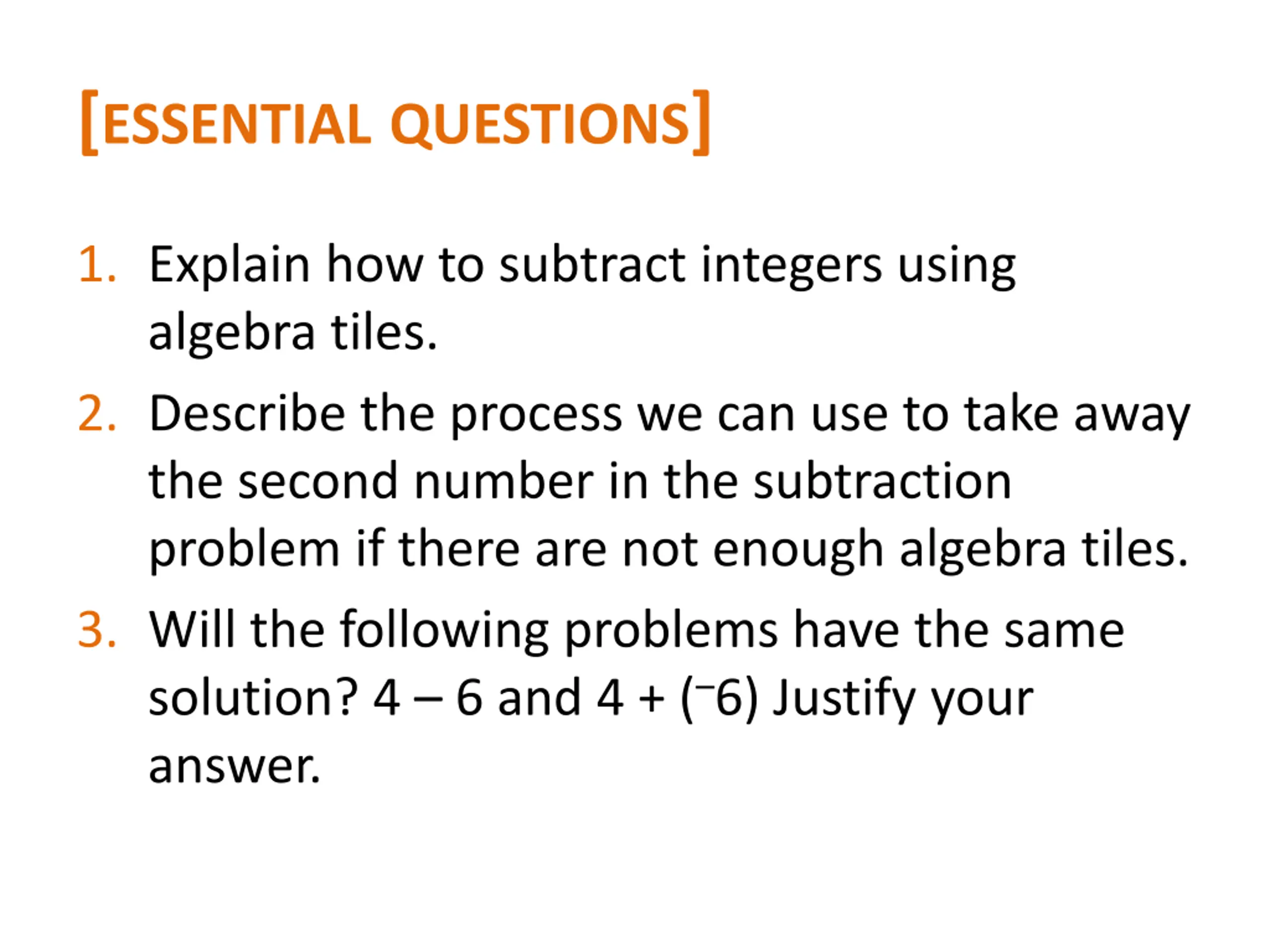 [ESSENTIALQUESTIONS] 1. Explain how to subtract integers using algebra tiles. 2. Describe the process we can use to take away the second number in the subtraction problem if there are not enough algebra tiles. 3. Will the following problems have the same solution? 4 6 and 4 + ( 6) Justify your answer.