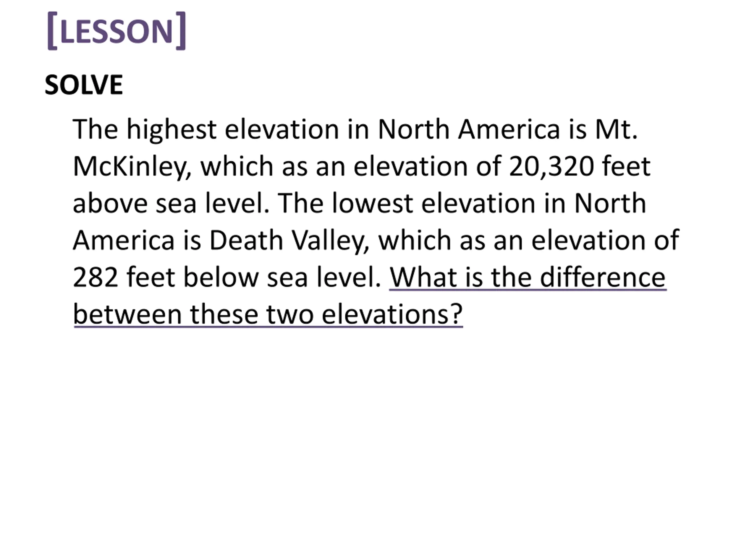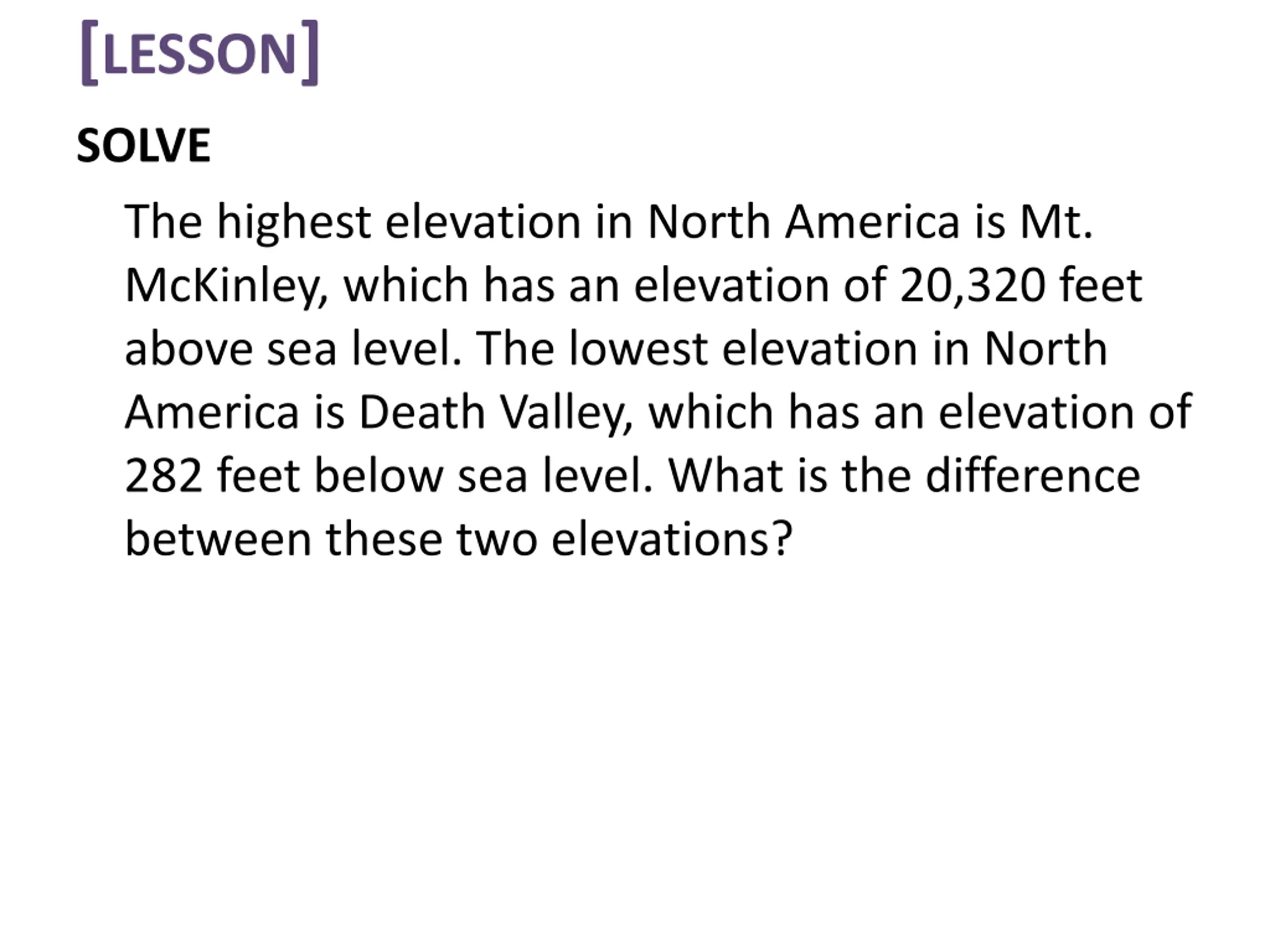 [LESSON] SOLVE The highest elevation in North America is Mt. McKinley, which has an elevation of 20,320 feet above sea level. The lowest elevation in North America is Death Valley, which has an elevation of 282 feet below sea level. What is the difference between these two elevations?