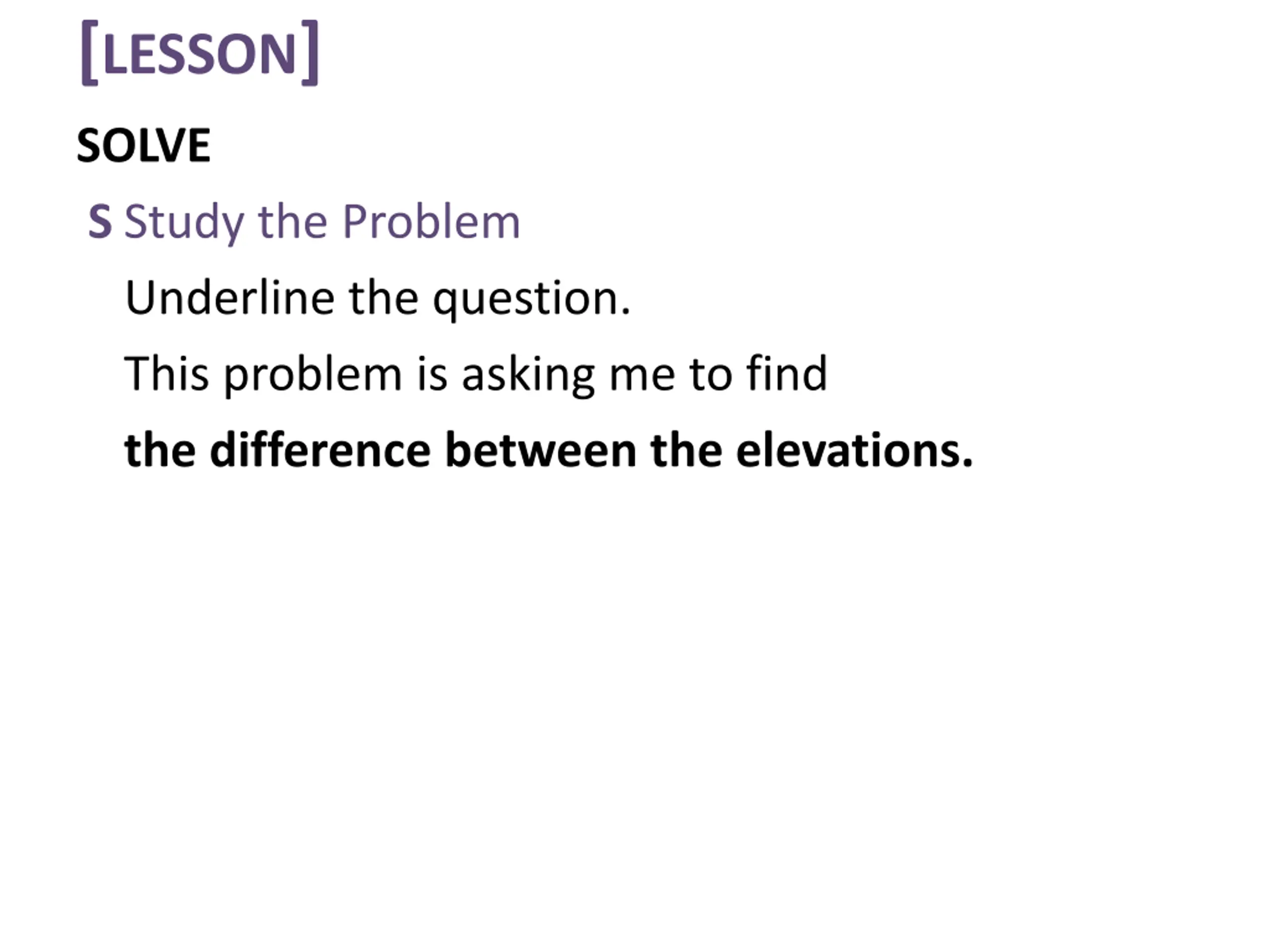 [LESSON] SOLVE S Study the Problem Underline the question. This problem is asking me to find the difference between the elevations.