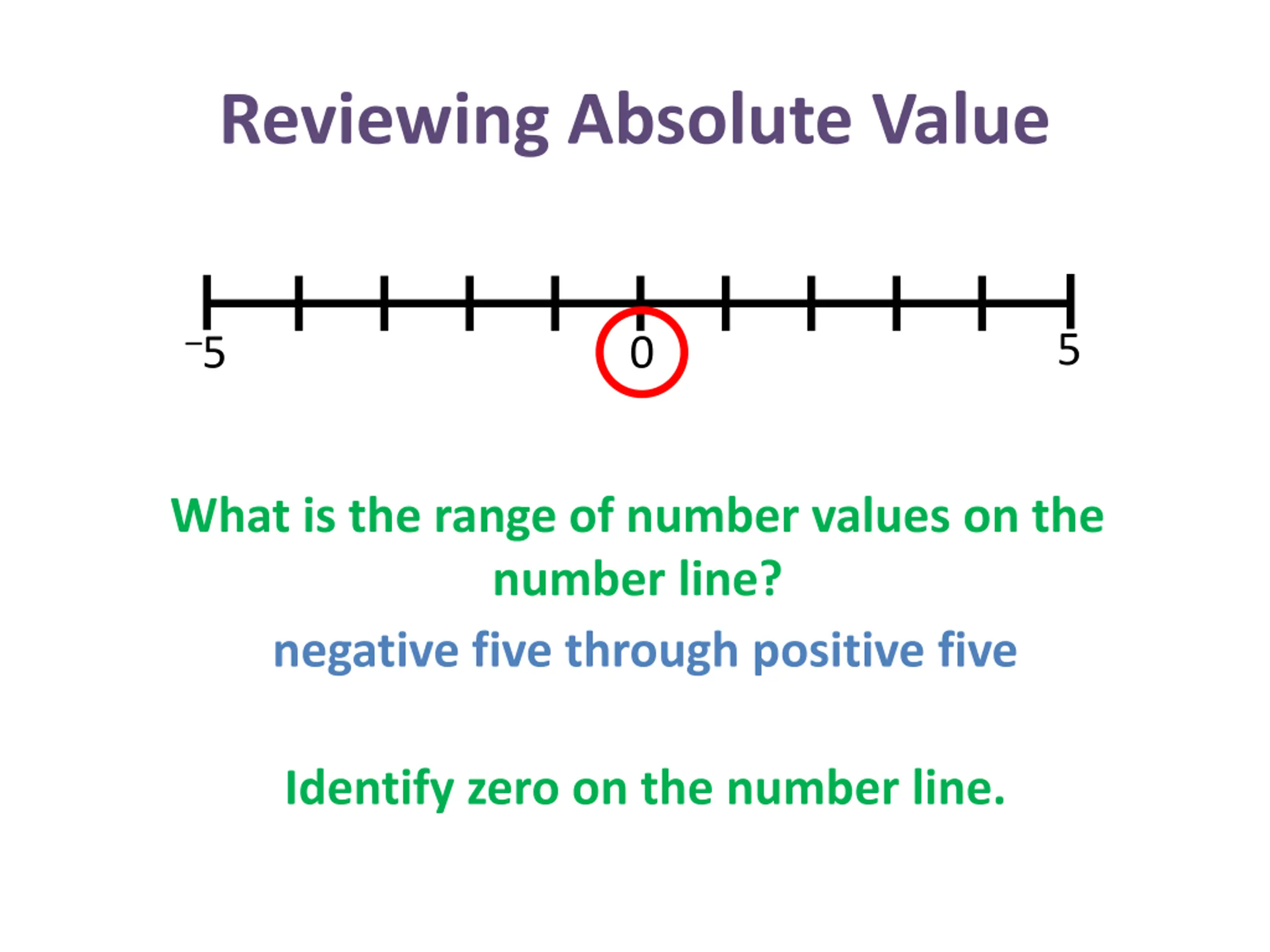 Reviewing Absolute Value 5 5 0 What is the range of number values on the number line? negative five through positive five Identify zero on the number line.