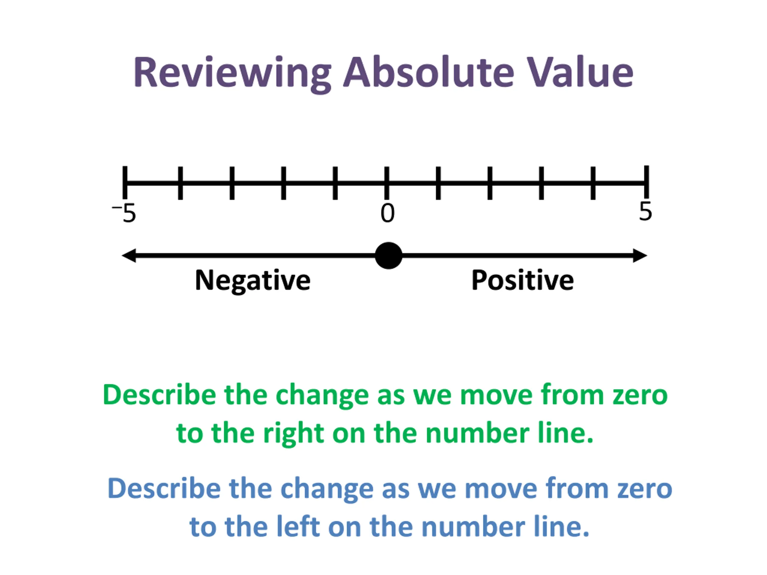 Reviewing Absolute Value 5 5 0 Negative Positive Describe the change as we move from zero to the right on the number line. Describe the change as we move from zero to the left on the number line.