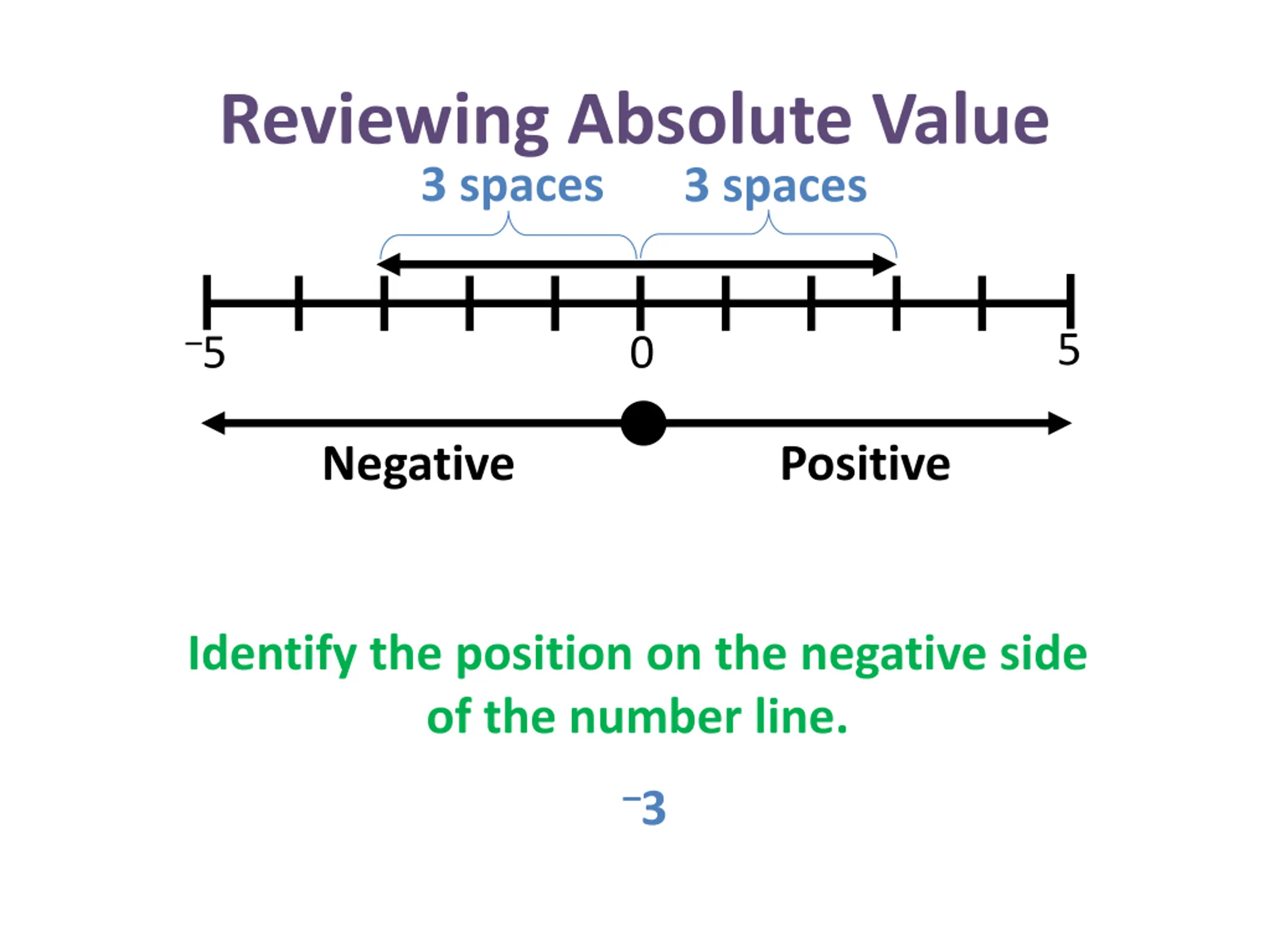 Reviewing Absolute Value 3 spaces 3 spaces 5 5 0 Negative Positive Identify the position on the negative side of the number line. 3
