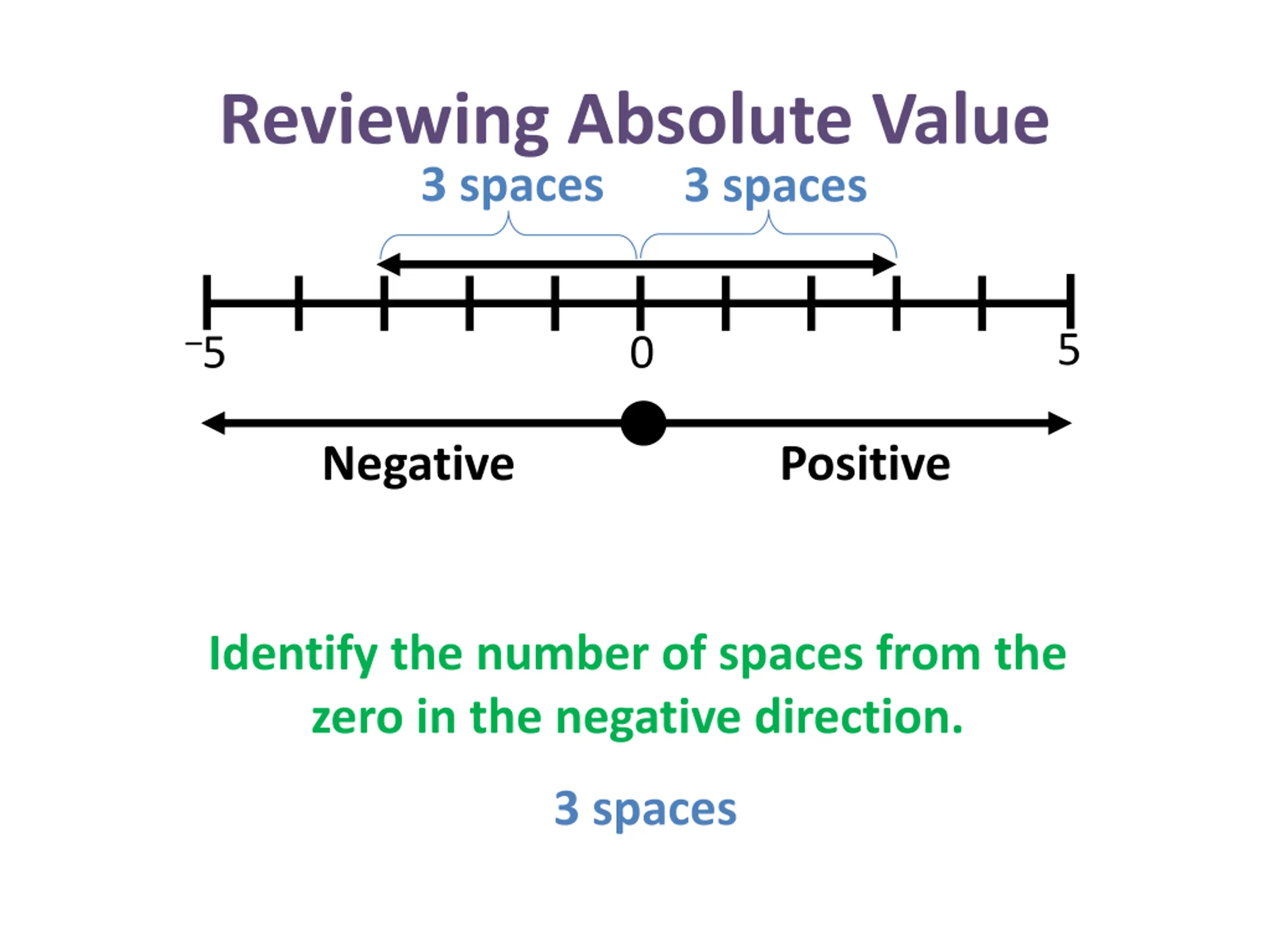Reviewing Absolute Value 3 spaces 5 5 0 Negative Positive Identify the number of spaces from the zero in the positive direction. 3 spaces