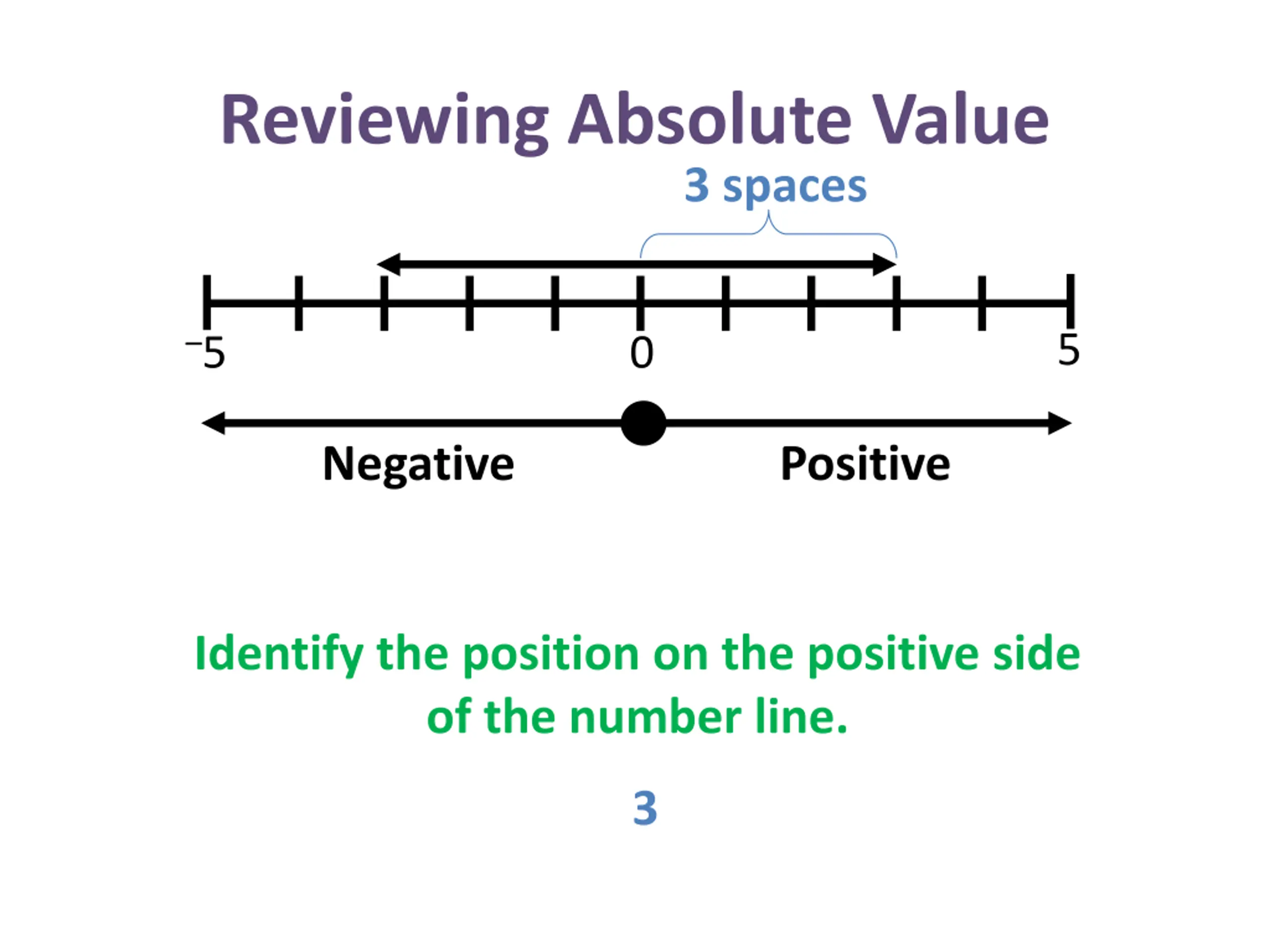 Reviewing Absolute Value 3 spaces 5 5 0 Negative Positive Identify the position on the positive side of the number line. 3