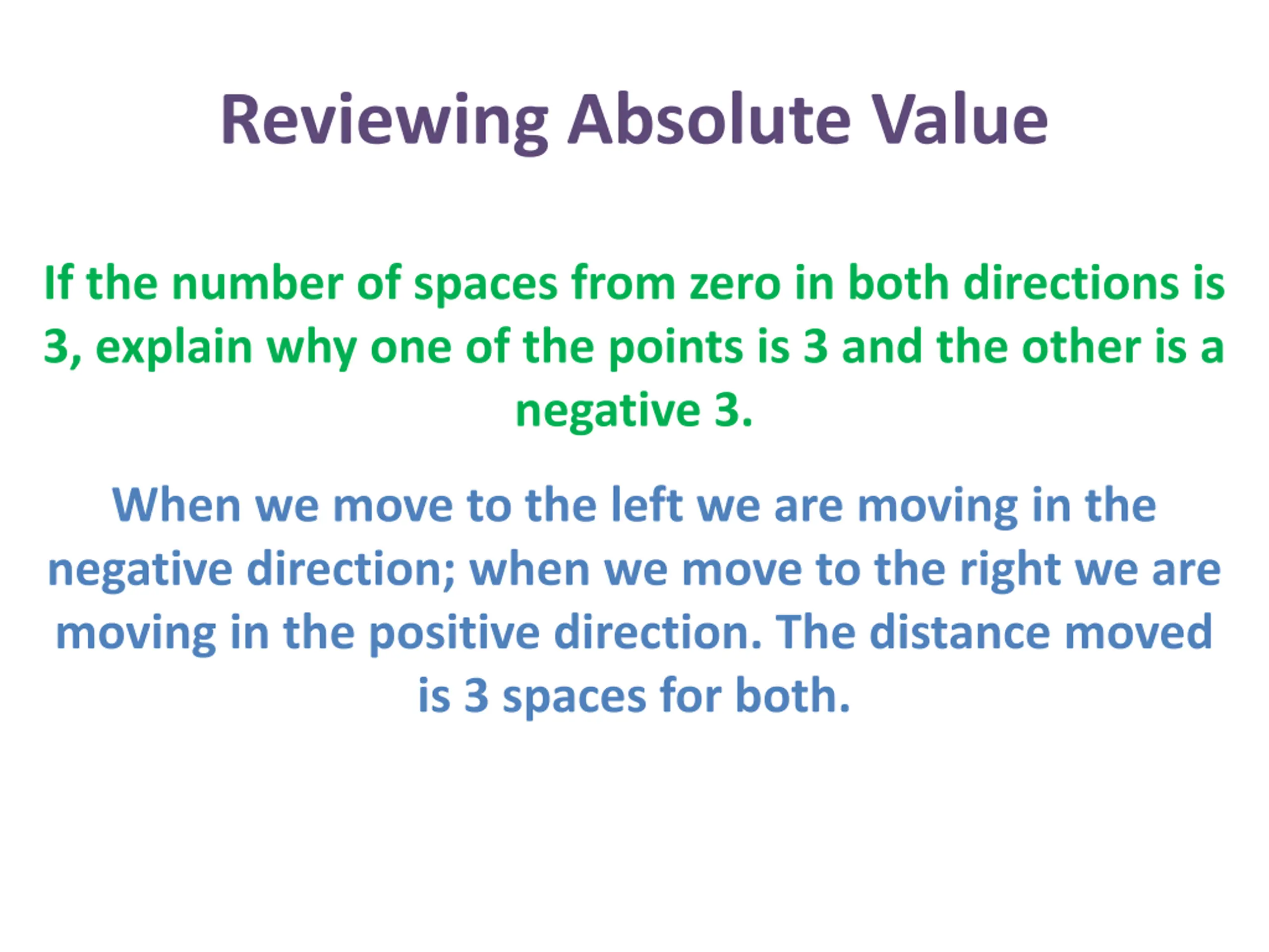Reviewing Absolute Value If the number of spaces from zero in both directions is 3, explain why one of the points is 3 and the other is a negative 3. When we move to the left we are moving in the negative direction; when we move to the right we are moving in the positive direction. The distance moved is 3 spaces for both.