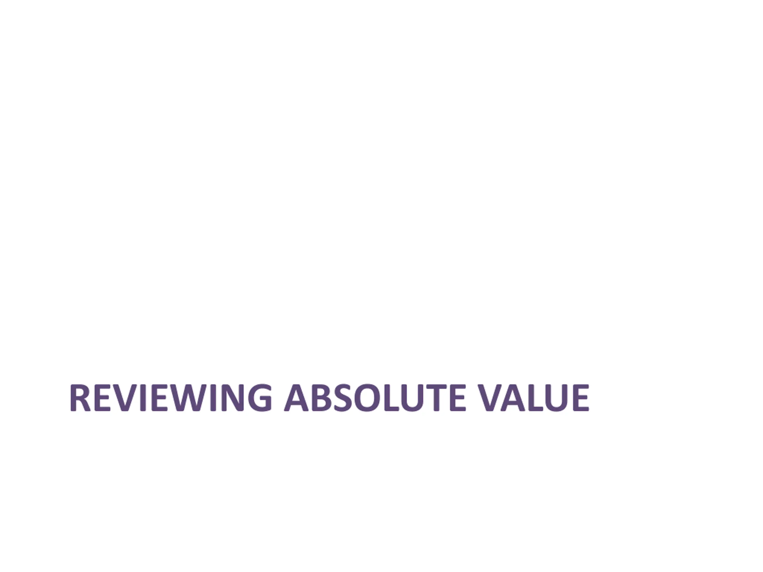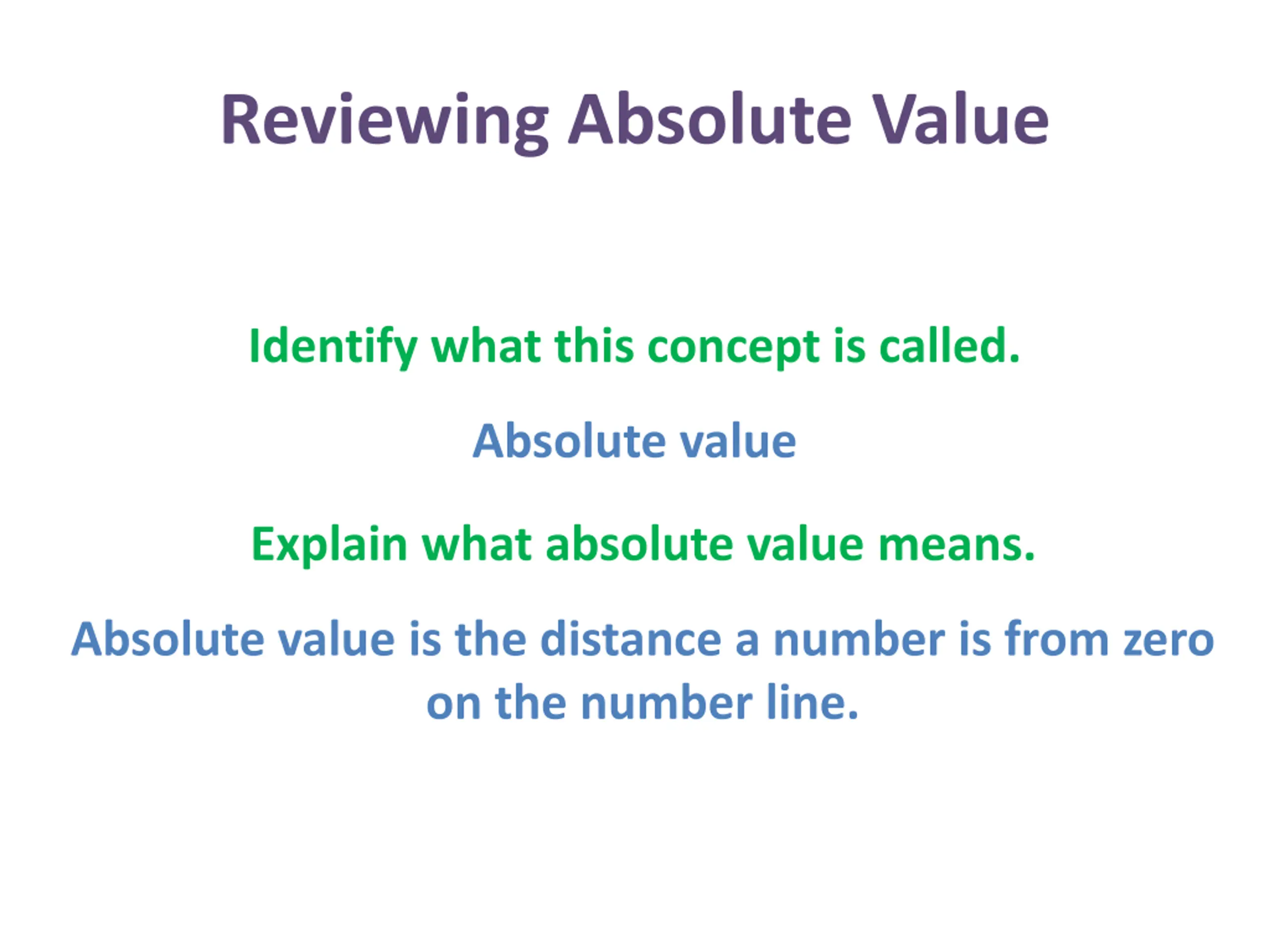 Reviewing Absolute Value Identify what this concept is called. Absolute value Explain what absolute value means. Absolute value is the distance a number is from zero on the number line.