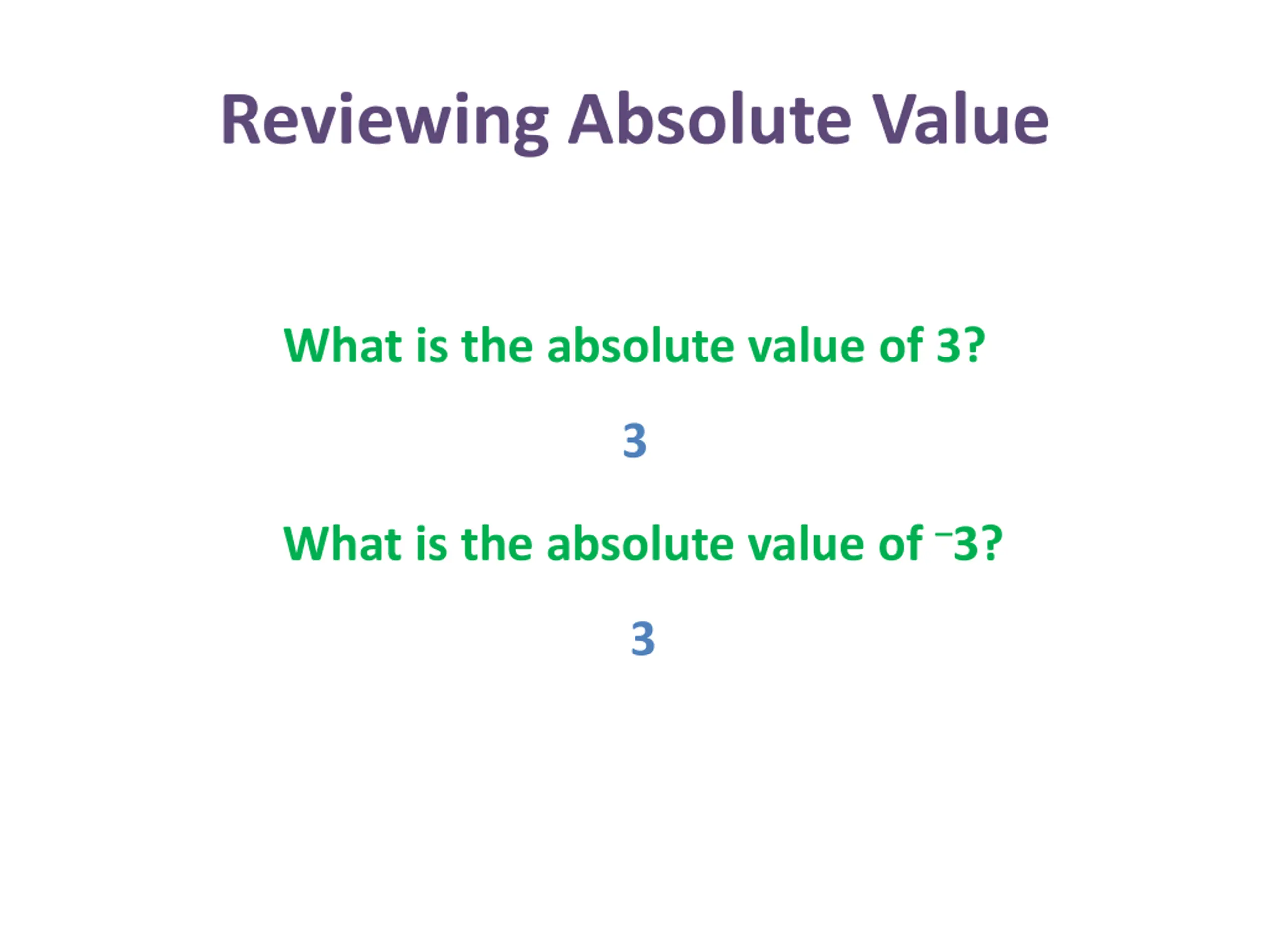 Reviewing Absolute Value What is the absolute value of 3? 3 What is the absolute value of 3? 3