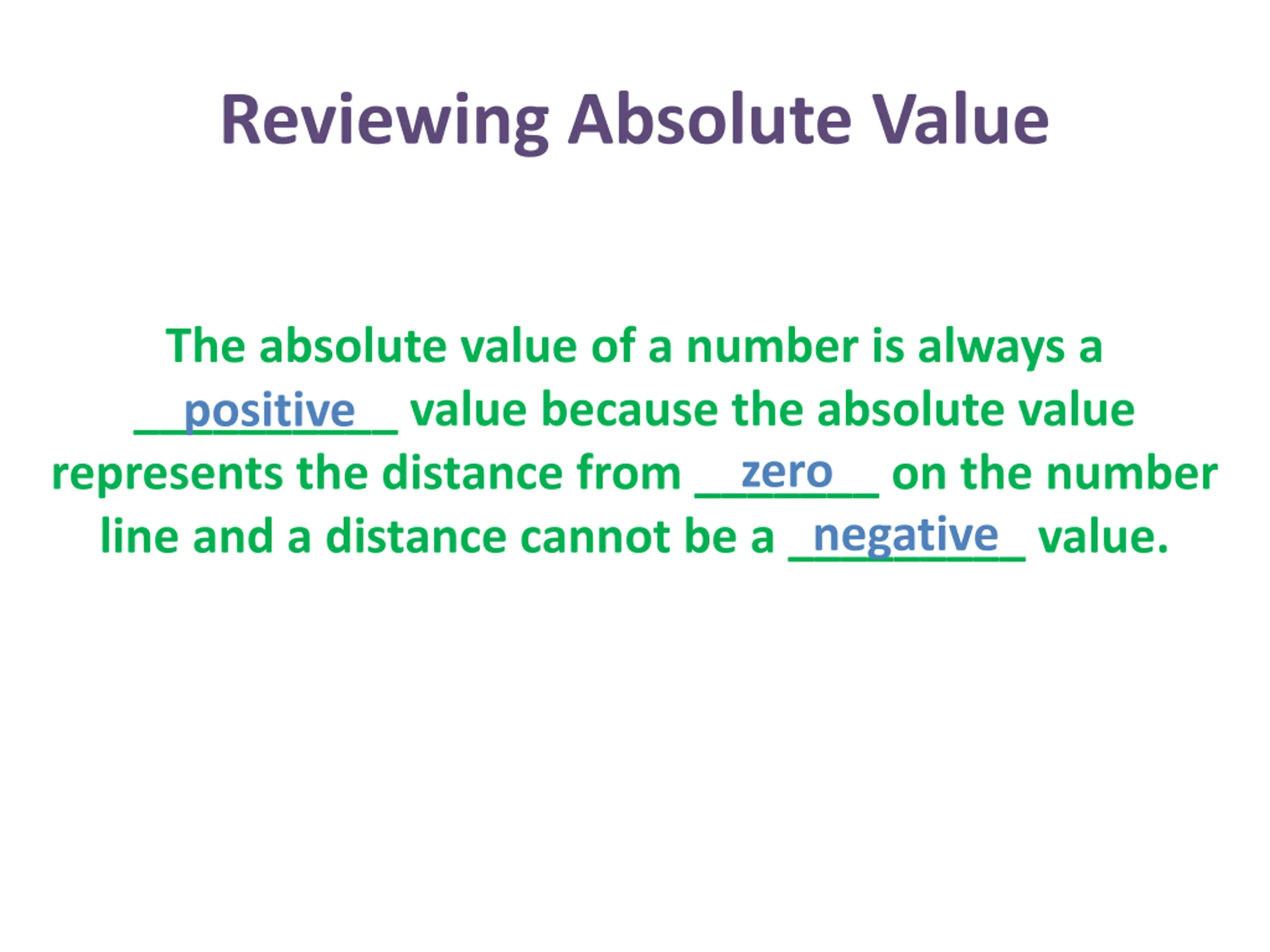Reviewing Absolute Value The absolute value of a number is always a __________ value because the absolute value represents the distance from _______ on the number line and a distance cannot be a _________ value. positive zero negative