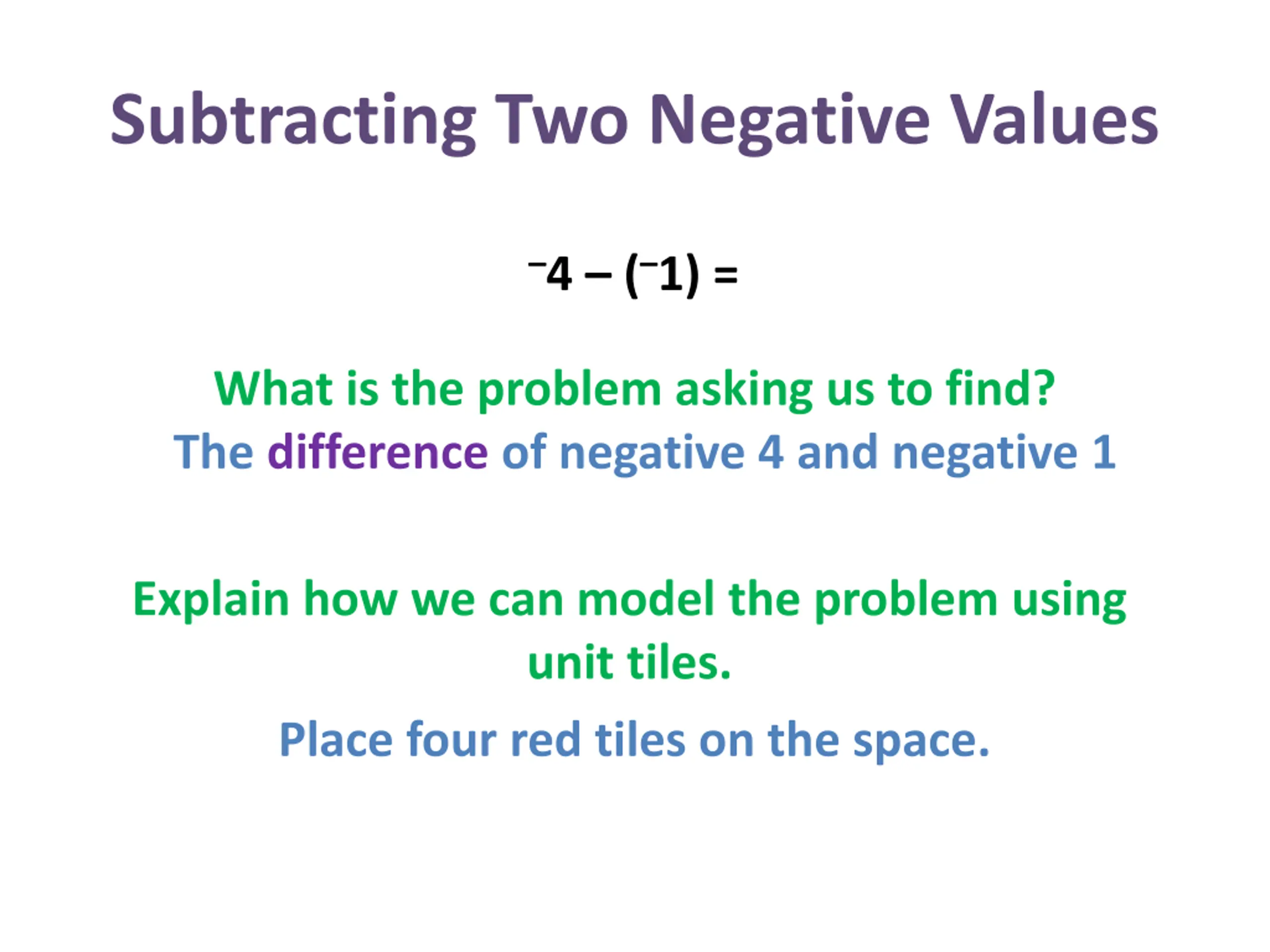 Subtracting Two Negative Values 4 ( 1) = What is the problem asking us to find? The difference of negative 4 and negative 1 Explain how we can model the problem using unit tiles. Place four red tiles on the space.