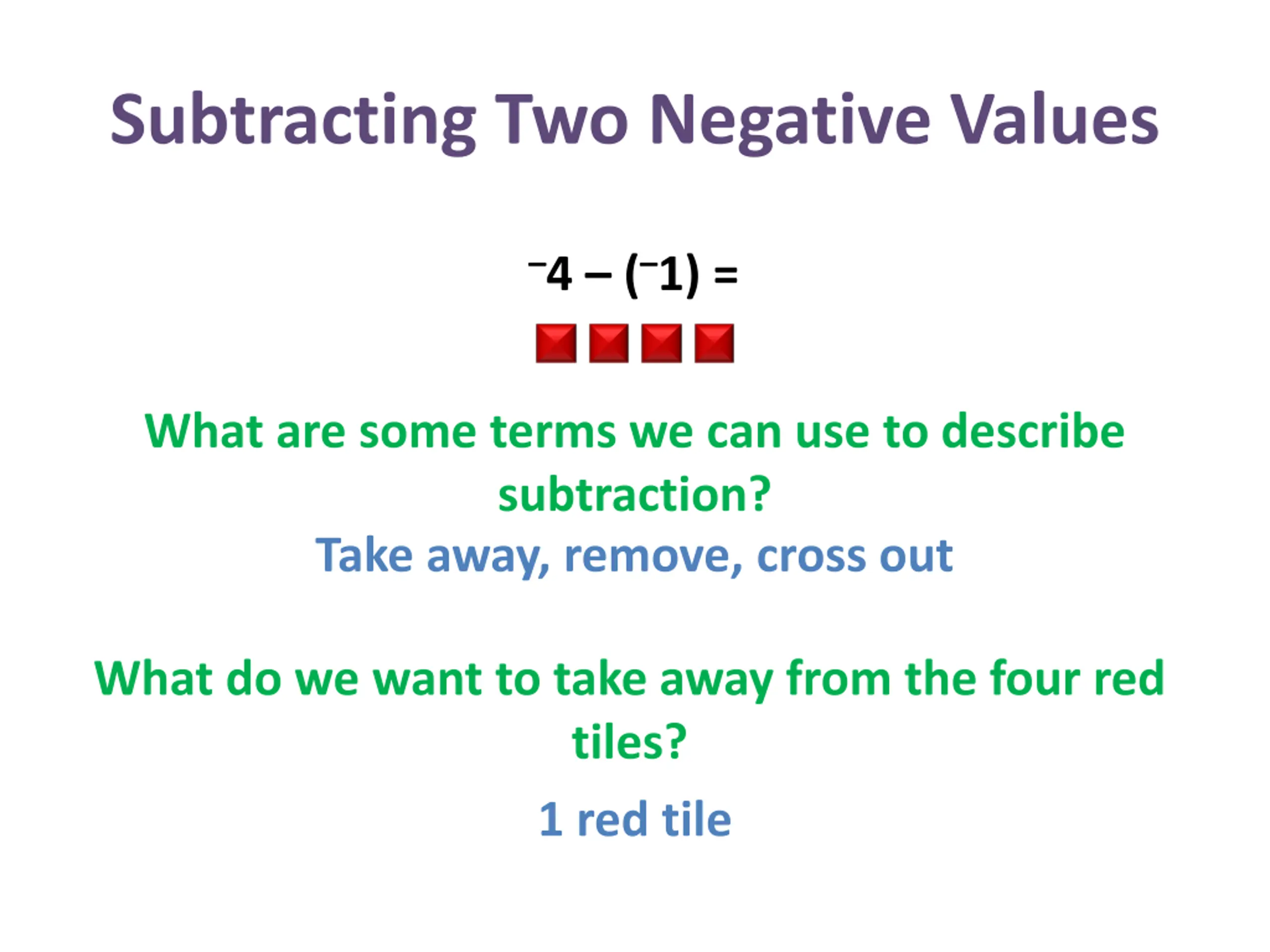 Subtracting Two Negative Values 4 ( 1) = What are some terms we can use to describe subtraction? Take away, remove, cross out What do we want to take away from the four red tiles? 1 red tile