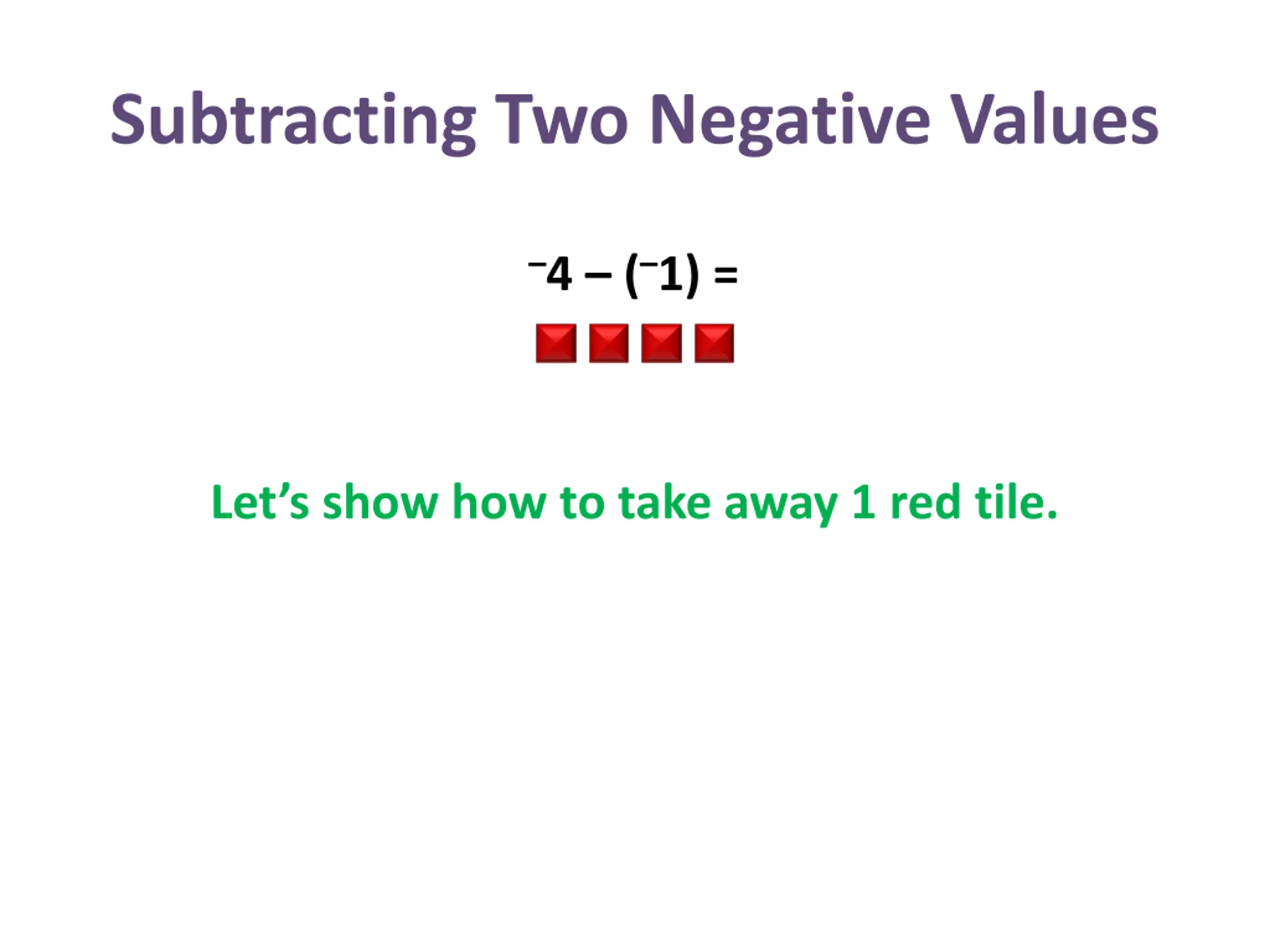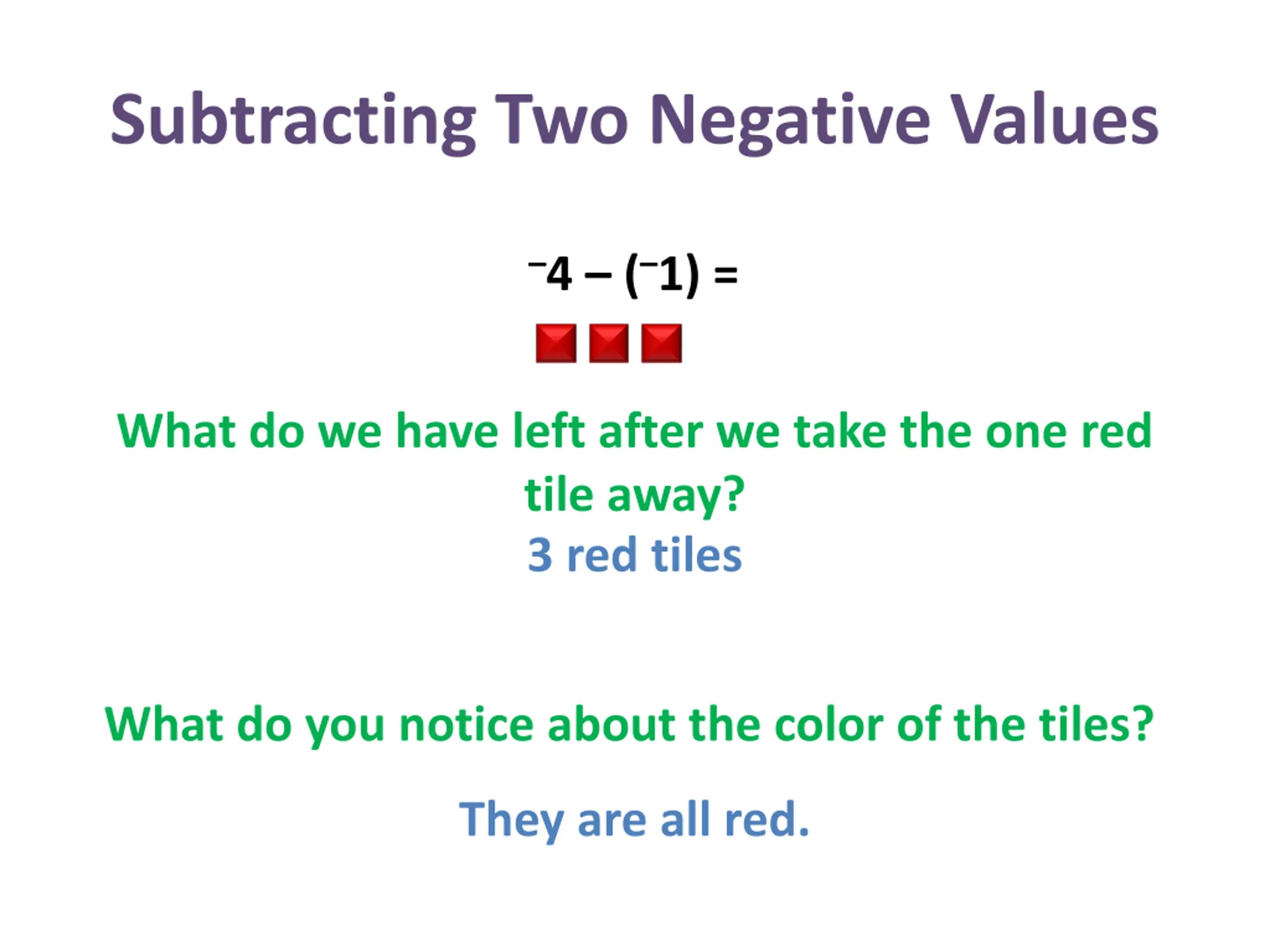 Subtracting Two Negative Values 4 ( 1) = What do we have left after we take the one red tile away? 3 red tiles What do you notice about the color of the tiles? They are all red.