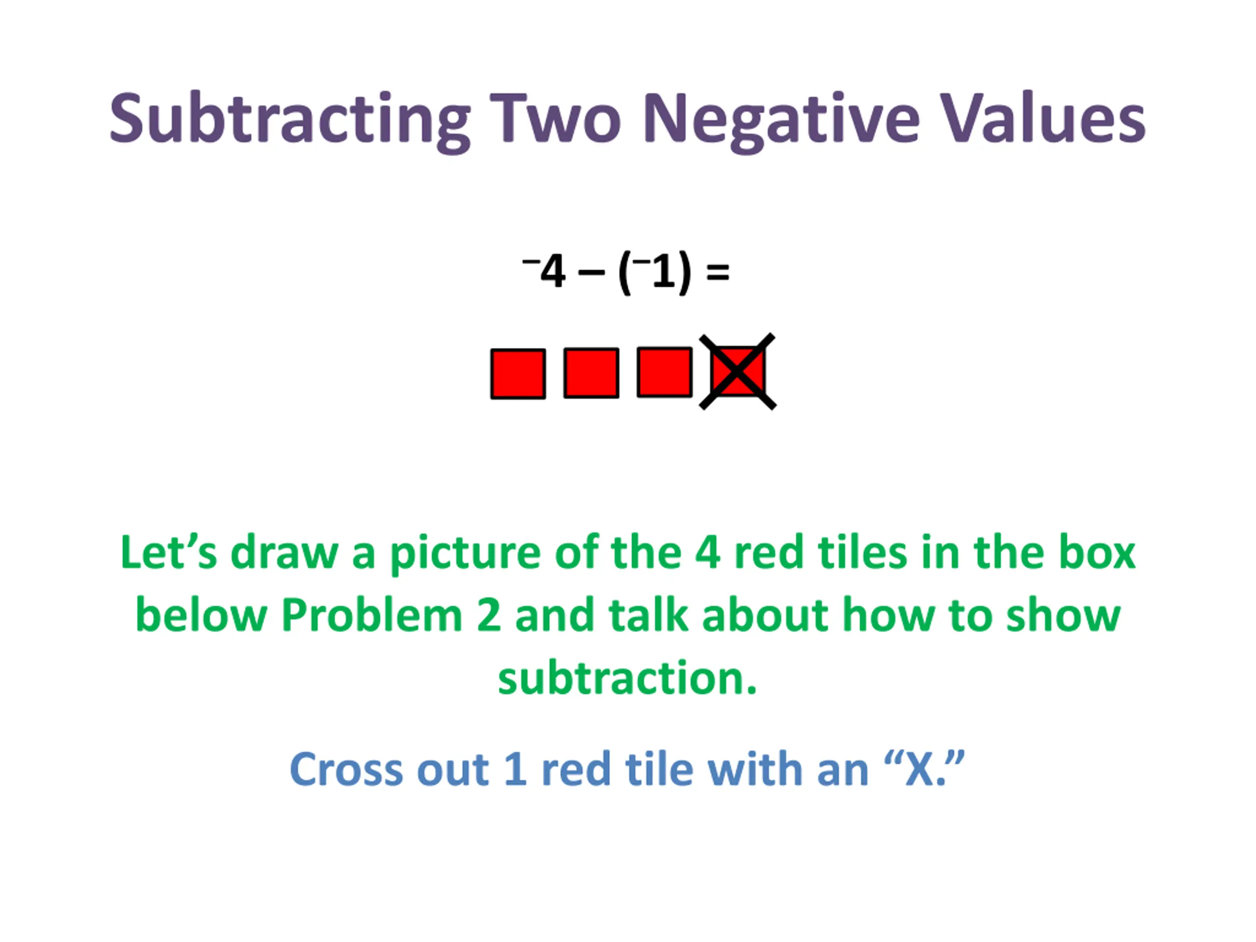 Subtracting Two Negative Values 4 ( 1) = Let s draw a picture of the 4 red tiles in the box below Problem 2 and talk about how to show subtraction. Cross out 1 red tile with an X.