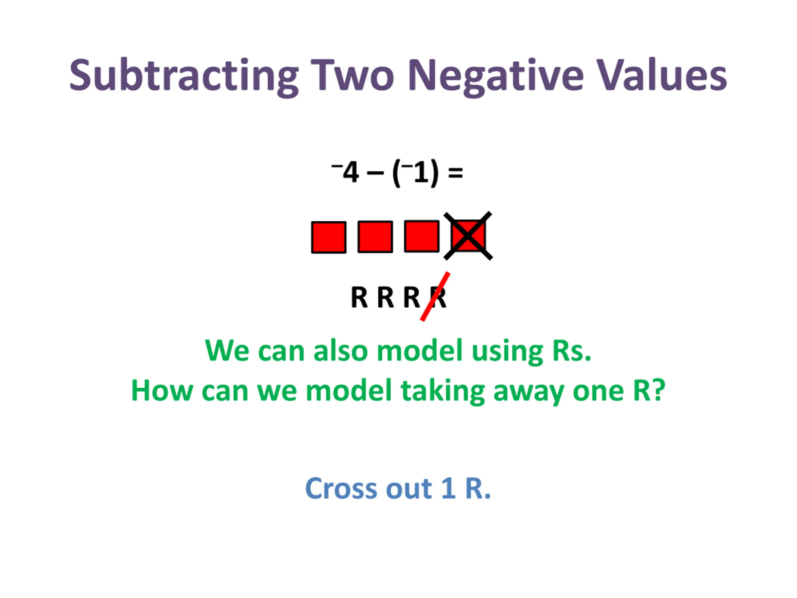 Subtracting Two Negative Values 4 ( 1) = R R R R We can also model using Rs. How can we model taking away one R? Cross out 1 R.
