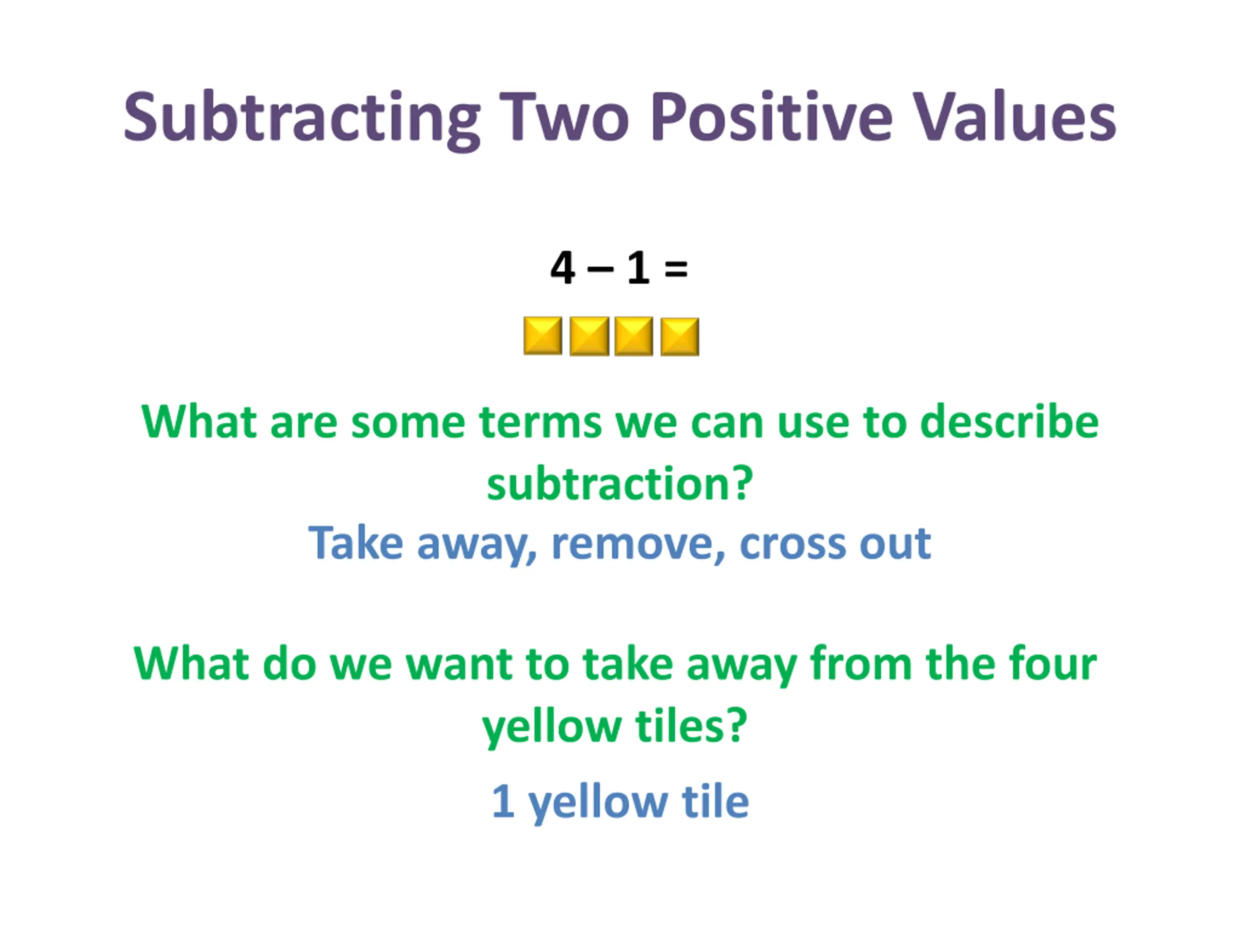Subtracting Two Positive Values 4 1 = What are some terms we can use to describe subtraction? Take away, remove, cross out What do we want to take away from the four yellow tiles? 1 yellow tile