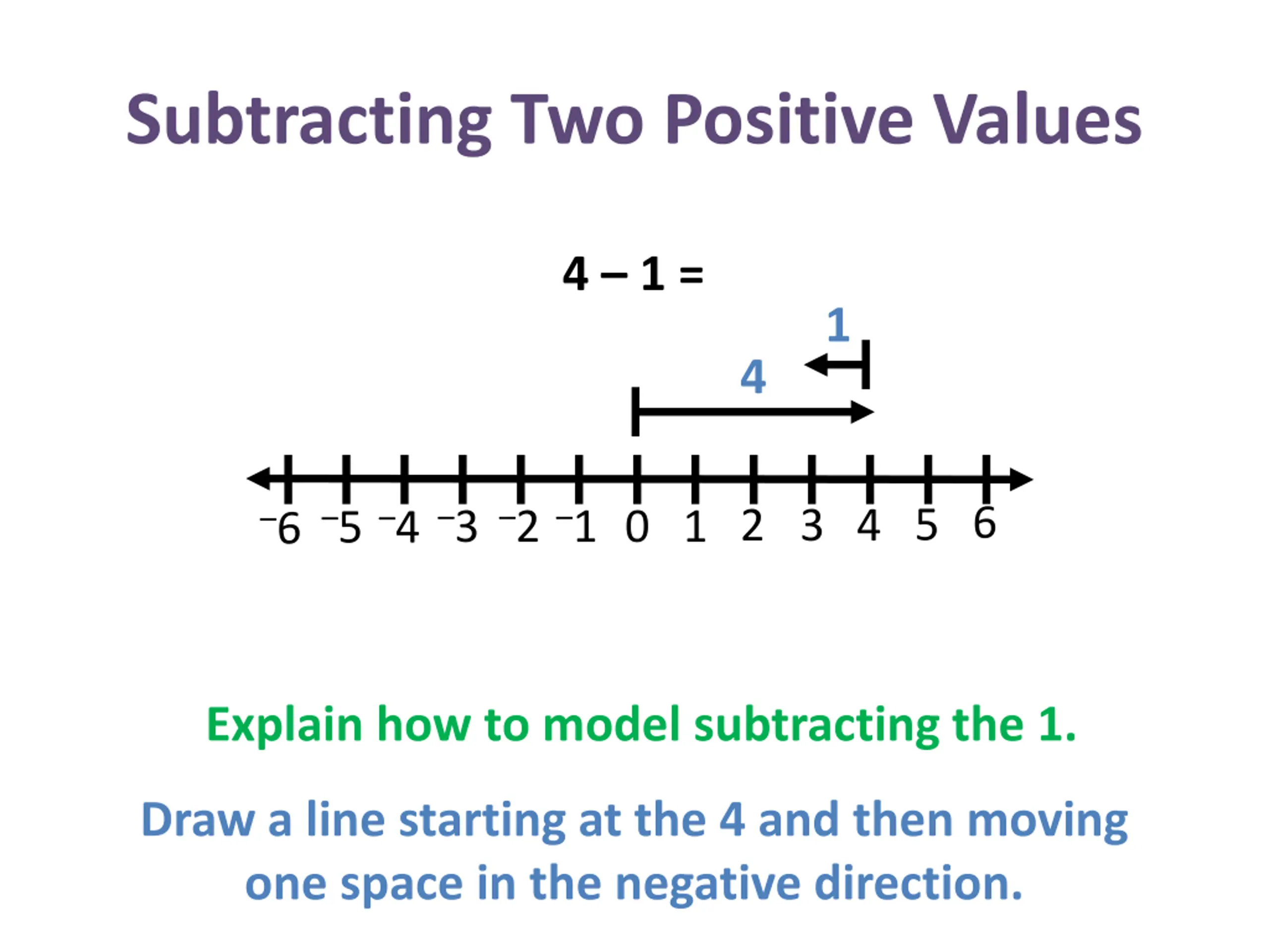 Subtracting Two Positive Values 4 1 = 1 4 3 4 5 6 3 2 1 4 5 2 6 1 0 Explain how to model subtracting the 1. Draw a line starting at the 4 and then moving one space in the negative direction.